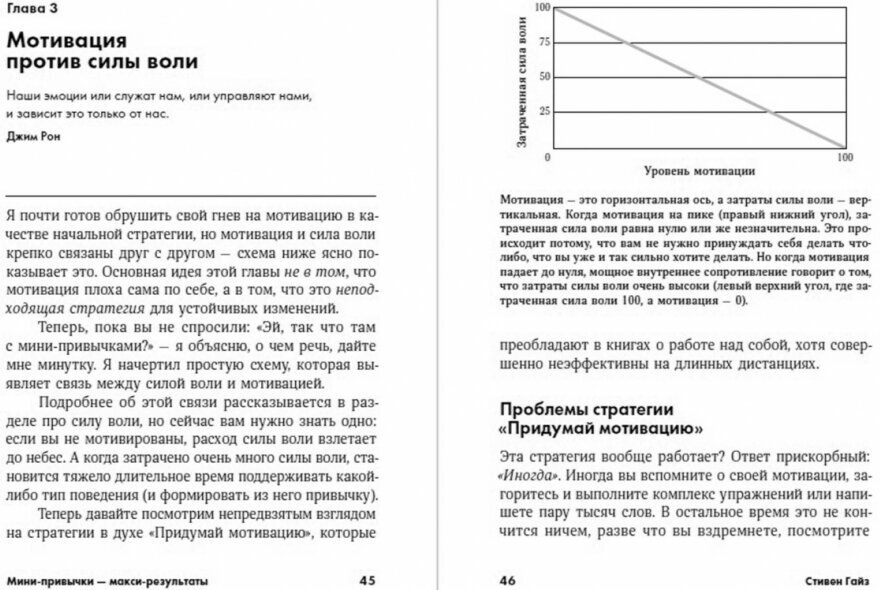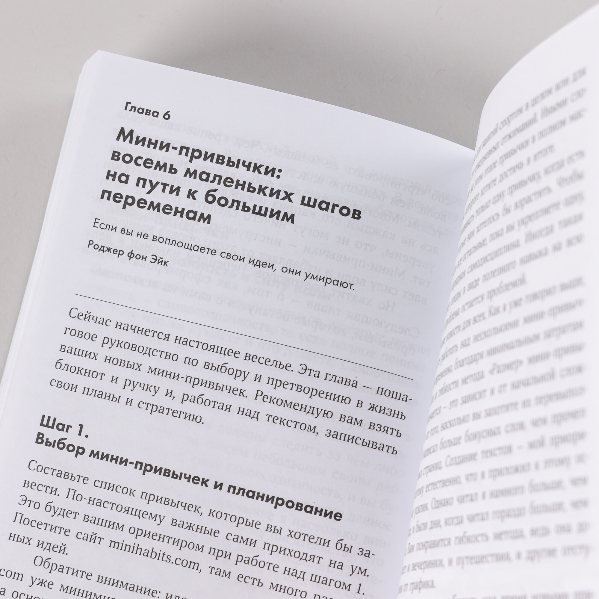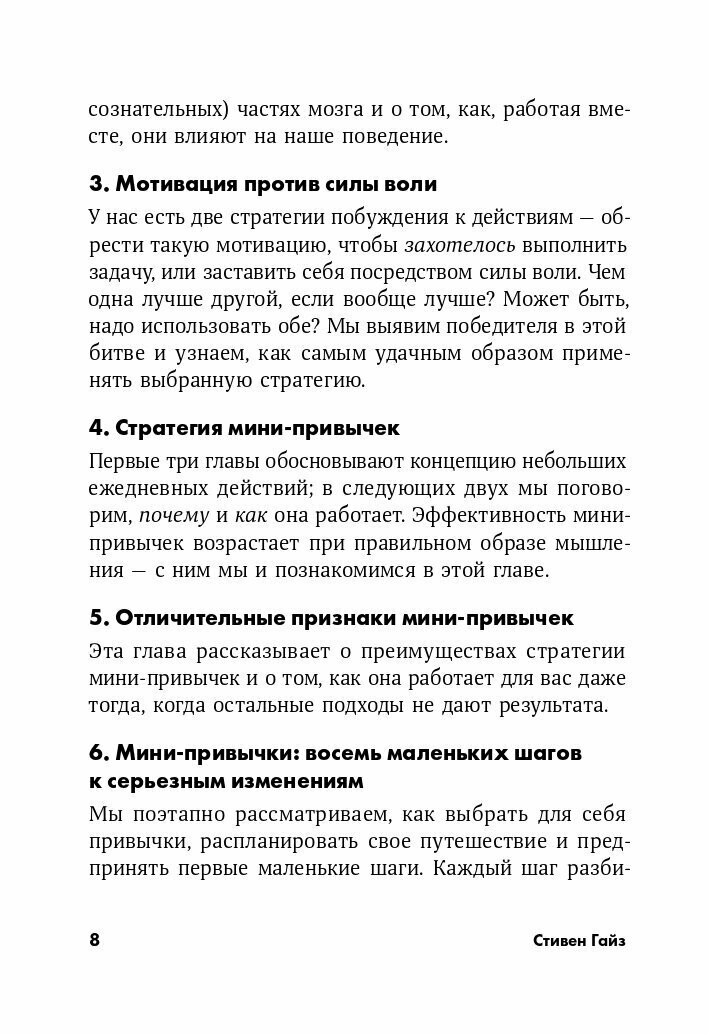 Планируя изменить жизнь к лучшему, не пытайтесь объять необъятное. Не ставьте себе глобальные цели — вы создадите лишний повод для стресса и, скорее всего, потерпите неудачу. И все потому, что наш мозг запрограммирован на сопротивление значительным переменам, поскольку стабильность — залог выживания.Стивен Гайз вывел стопроцентно работающий механизм создания и закрепления так называемых мини-привычек, которые, несомненно, изменят вашу жизнь к лучшему. Он предлагает разбить задачу на небольшие шаги, которые будет легко и просто включить в ваш привычный распорядок дня, не «испугав» ваш мозг. Хотите делать 100 отжиманий в день — начните с одного. Собираетесь научиться чаще мыслить позитивно — вспоминайте что-то хорошее хотя бы пару раз в день. Со временем незначительные изменения превратятся в нужную вам привычку, а вы поверите в собственные силы.