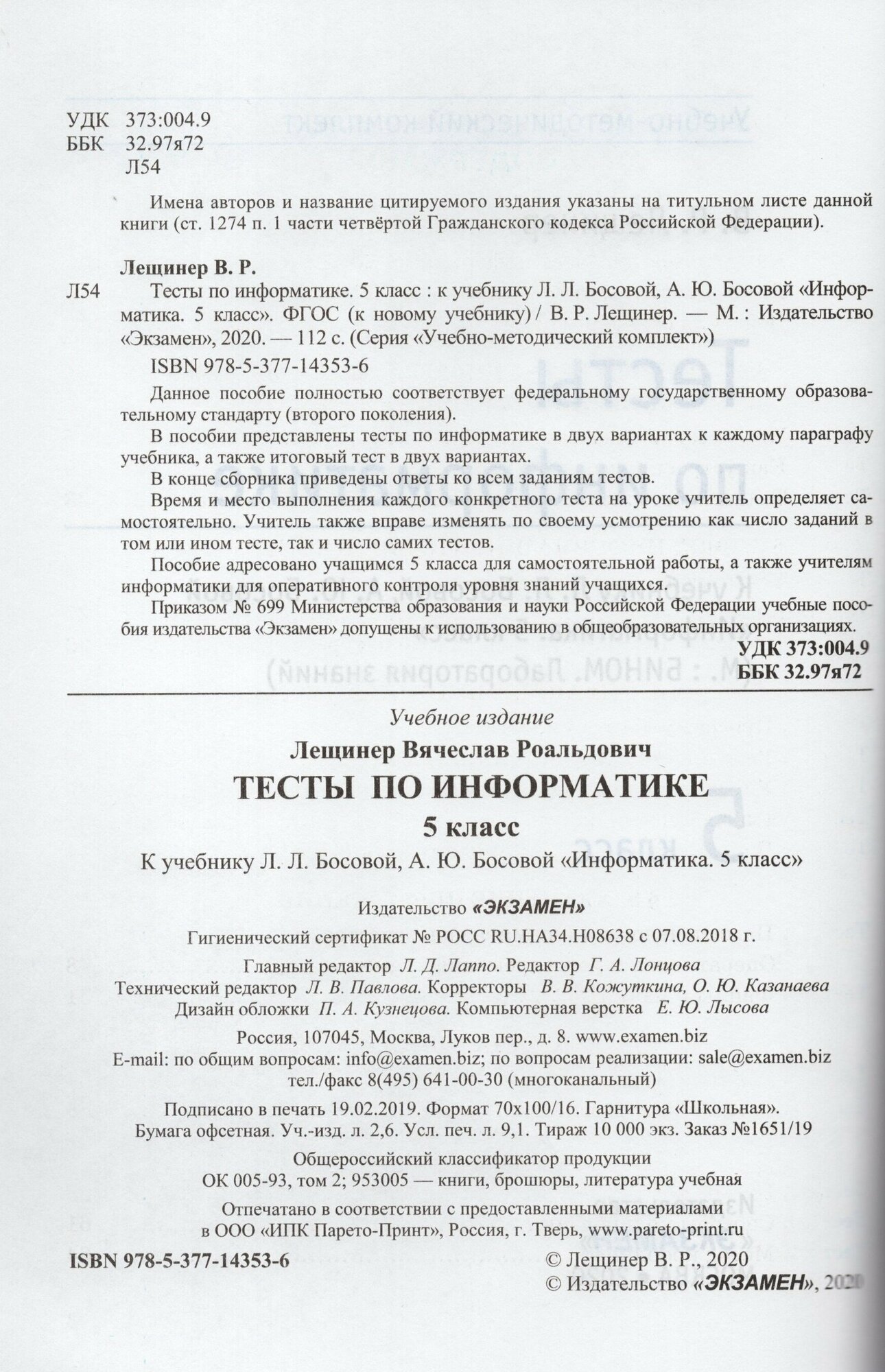 УМК. Тесты по информатике 5 кл. Босова. (к новому учебнику) (Лещинер Вячеслав Роальдович); Экзамен, 2020