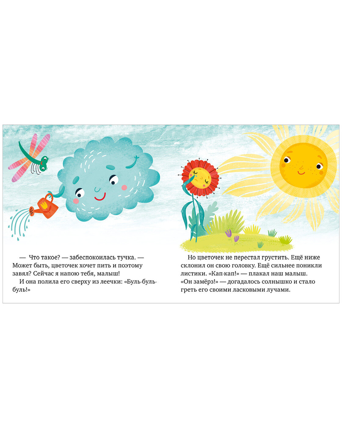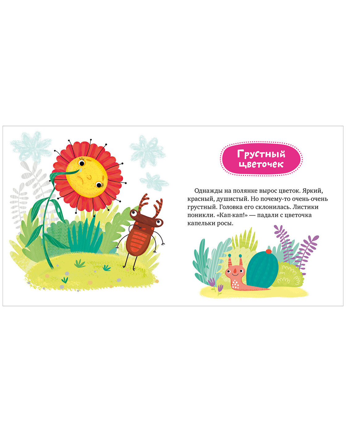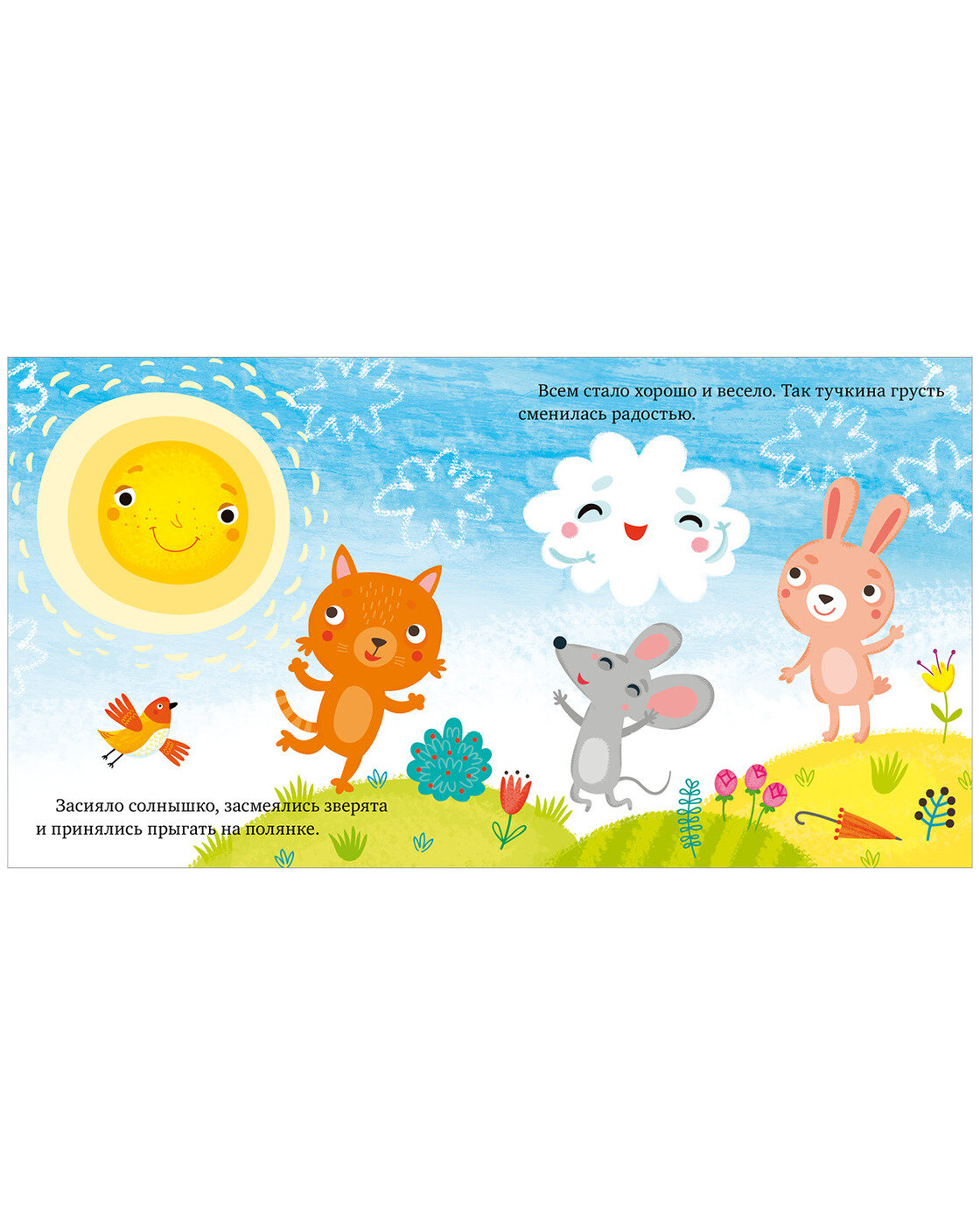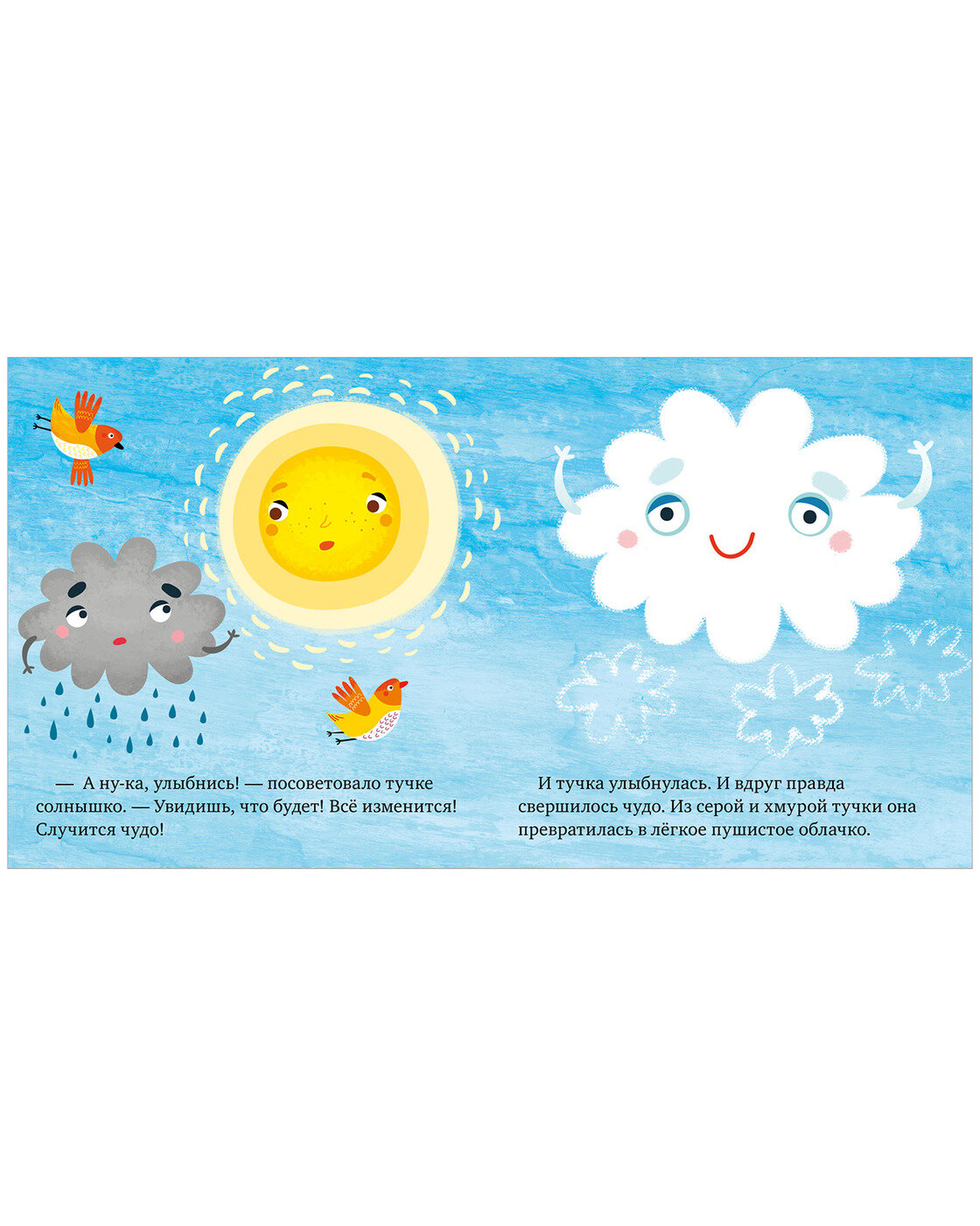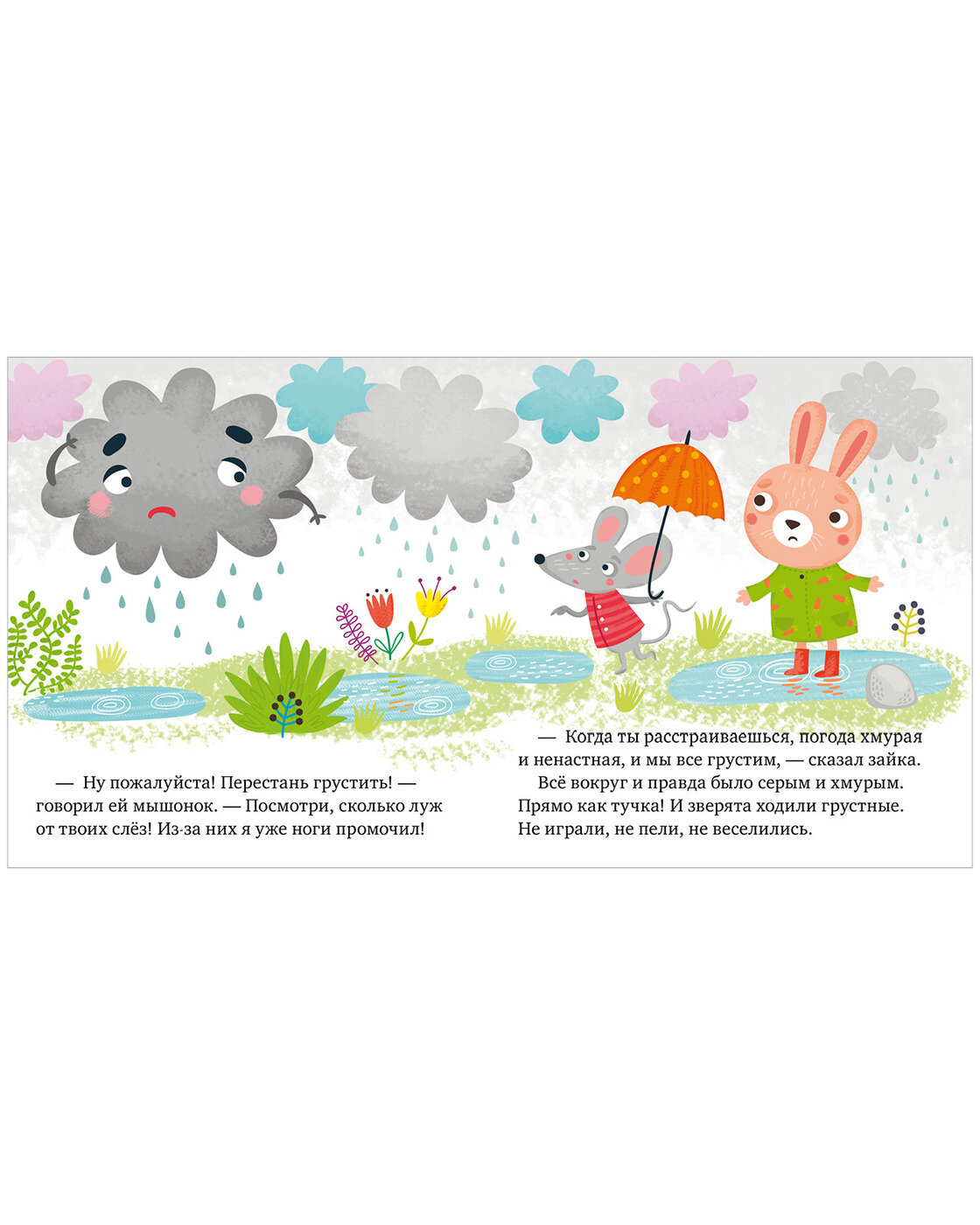 Из сказки о хмурой тучке малыш узнает, как его печаль может повлиять на окружающих и что, улыбнувшись, он может измениться сам и принести радость близким. А история о грустном цветочке расскажет о взаимопомощи и как не грустить из-за одиночества и найти друзей. В конце книжки для малыша приготовлены вопросы, отвечая на которые он не только играет, но и закрепляет пройденный материал.