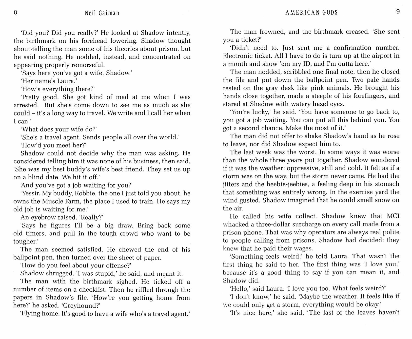 After three years in prison, Shadow has done his time. But as the time until his release ticks away, he can feel a storm brewing. Two days before he gets out, his wife Laura dies in a mysterious car crash, in adulterous circumstances. Dazed, Shadow travels home, only to encounter the bizarre Mr Wednesday claiming to be a refugee from a distant war, a former god and the king of America. Together they embark on a very strange journey across the States, along the way solving the murders which have occurred every winter in one small American town. But the storm is about to break... Disturbing, gripping and profoundly strange, Gaiman's epic new novel sees him on the road to the heart of America.