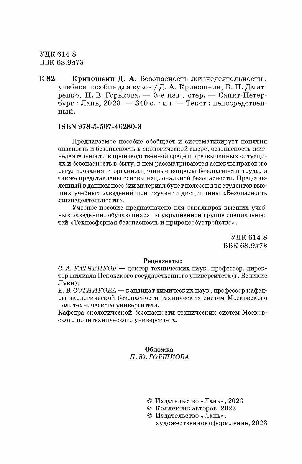 Безопасность жизнедеятельности. Учебное пособие (Кривошеин Дмитрий Александрович, Дмитриенко Владимир Петрович, Горькова Наталья Владимировна); Лань, 2019