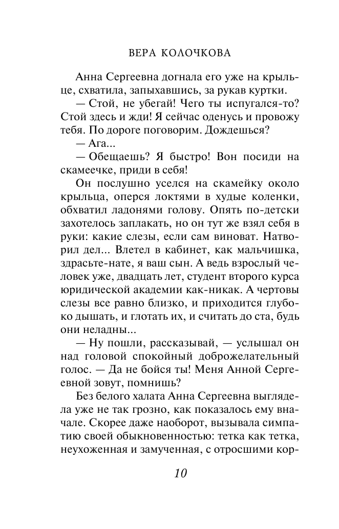 Всегда читаю романы автора и с нетерпением жду новинку. Хорошо, что довольно часто появляется новый роман, плохо то, что часто старый роман издается под новым названием, а в выходных данных книги это указывается редко (несколько раз так ошибалась). Когда читаете Веру Колочкову, обязательно запасайтесь бумажными платками - не раз "над вымыслом слезами обольетесь". Герои ее романов очень узнаваемы, автор пишет о простых людях, наших с вами соседях, близких, знакомых. Язык ее романов особенный, автор мне напоминает сказительницу, а любой ее роман это напев или сказание.Читайте роман и наслаждайтесь общением со стилем автора!