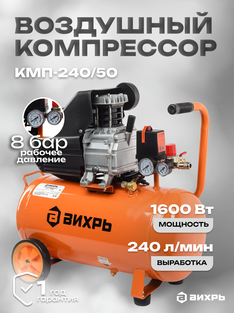 Компрессор ВИХРЬ КМП-240/50 позволяет нагнетать сжатый воздух в пистолеты для накачки шин, краскопульты, пистолеты для продувки и многое другое. Вихрь КМП-240/50 используется для выполнения механических работ широкого плана. Компрессор имеет высокую мощность в 1600 Вт, благодаря которой на выходе образуется давление в 8 бар хороший показатель для современных компрессоров. Производительность модели ВИХРЬ КМП-240/50 составляет 240 л/мин, при объеме ресивера 50 л. Для удобной транспортировки компрессор оснащён 2-я колесами.