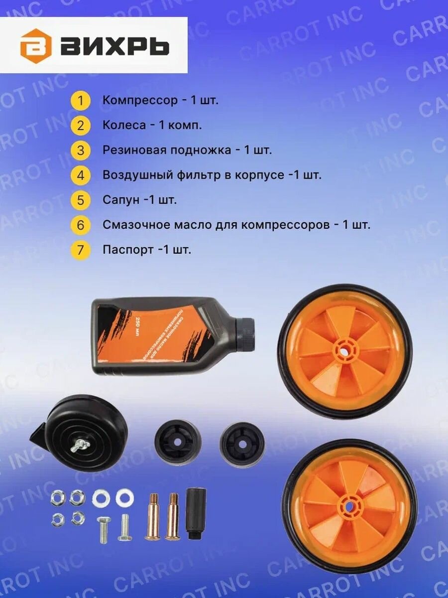| Комплектация | Компрессор – 1 шт. Колеса (комплект) – 1 шт. Сапун масляный – 1 шт. Смазочное масло для поршневых компрессоров в пластмассовой емкости (250 мл) – 1 шт. Инструкция – 1 шт. Упаковка – 1 шт. |