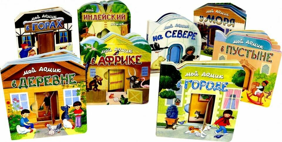 Каждая книжка-домик - это целый мир, в котором дети и взрослые играют, купаются в море или озере, катаются на лыжах, плавают на каноэ или каяке, ездят верхом на верблюдах, лепят снеговиков и стреляют из лука. Индейский, африканский, деревенский, городской, на море и в горах, на Крайнем Севере и в пустыне - все эти домики очень разные, но в каждом живет дружная и весёлая семья.