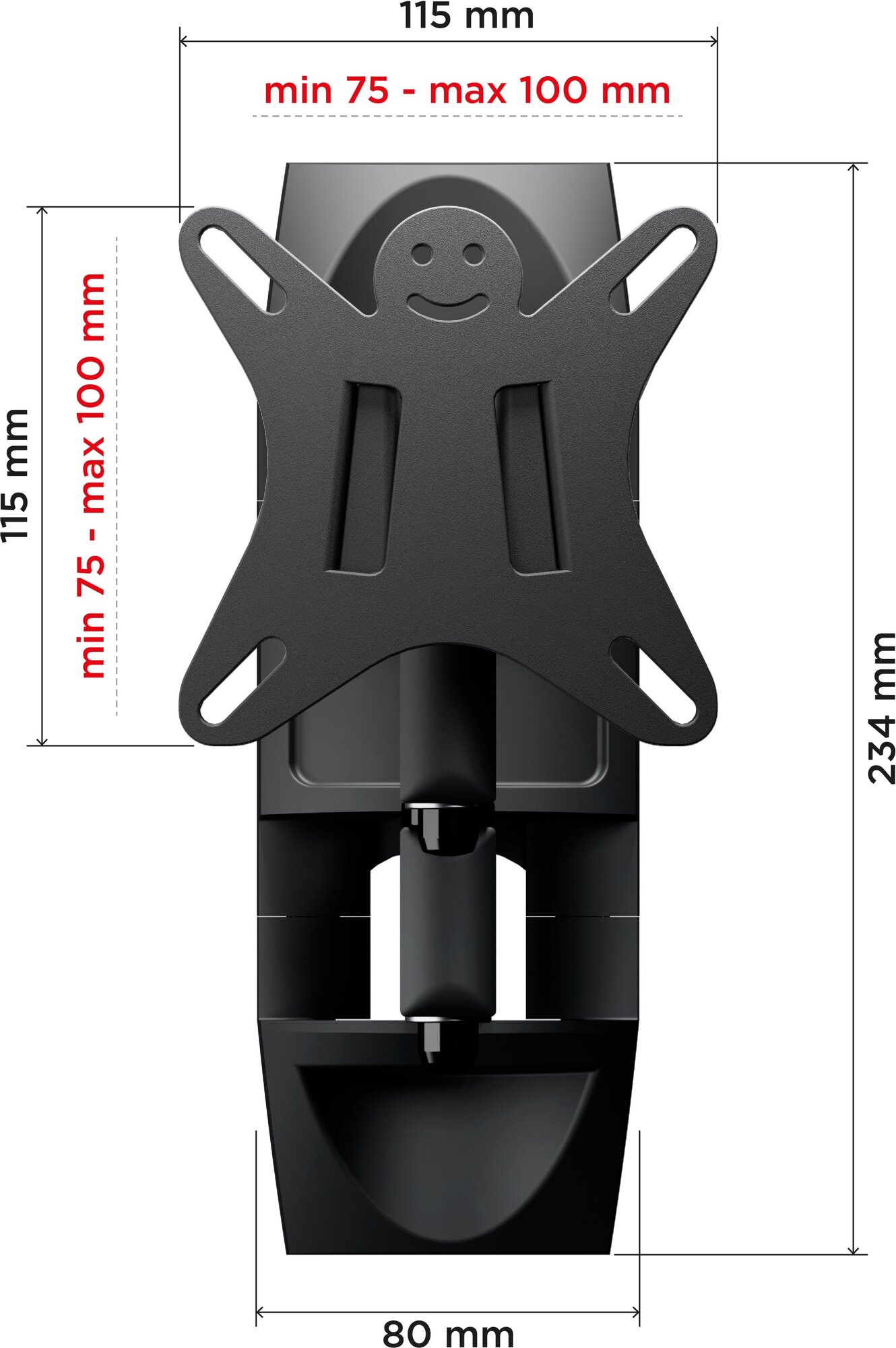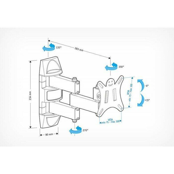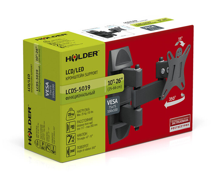 Кронштейн Holder с регулировкой расстояния от стены предназначен для небольших телевизоров. Расстояние можно менять от 117 мм до 283 мм. Кронштейн рассчитан на телевизоры с диагональю экрана от 10 до 26 дюймов и весом не больше 25 кг. Он имеет два типа стандартных отверстий VESA: 75х75 мм и 100х100 мм. Кронштейн можно поворачивать на 350 градусов, а также поднимать на 6 градусов верх и опускать на 15 вниз - конструкция легко двигается за счет трех шарниров.