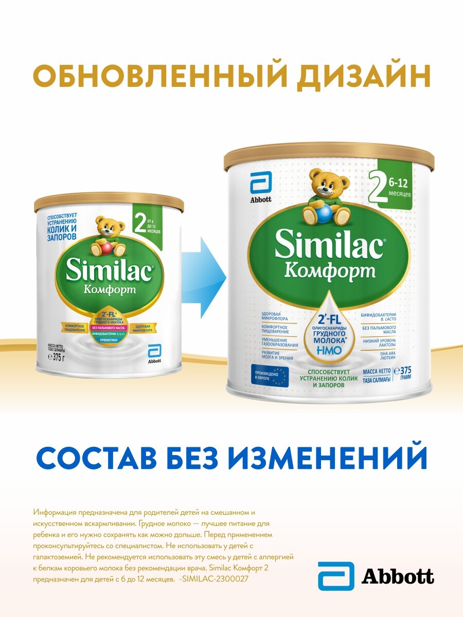 Снижение симптомов колик на 20% уже после 1 дня кормленияSimilac Комфорт — смесь для детей с коликами и запорами с олигосахаридами грудного молока 2’-FL2 — уникальным ингредиентом, который ранее был обнаружен3 только в грудном молоке. Новый олигосахарид грудного молока 2’-FL — еще один компонент подтвержденного исследованиями комплекса Similac для комфортного пищеварения и укрепления иммунитета.Similac Комфорт содержит олигосахариды 2’-FL, которые стимулируют рост полезных бактерий в кишечнике, защищают организм ребенка от инфекций и способствуют укреплению иммунитета.Частично гидролизованный сывороточный белок легко переваривается и способствует уменьшению колик и запоров.Бифидобактерии B.lactis — эффективный и хорошо изученный пробиотик, помогающий развитию здоровой микрофлоры кишечника и поддержанию здоровья пищеварительной системы.Пребиотики FOS являются пищей для полезной микрофлоры кишечника, способствуют мягкому стулу.Нуклеотиды — строительный материал для ДНК всех клеток организма.Отсутствие пальмового масла способствует уменьшению запоров и более высокому усвоению кальция.