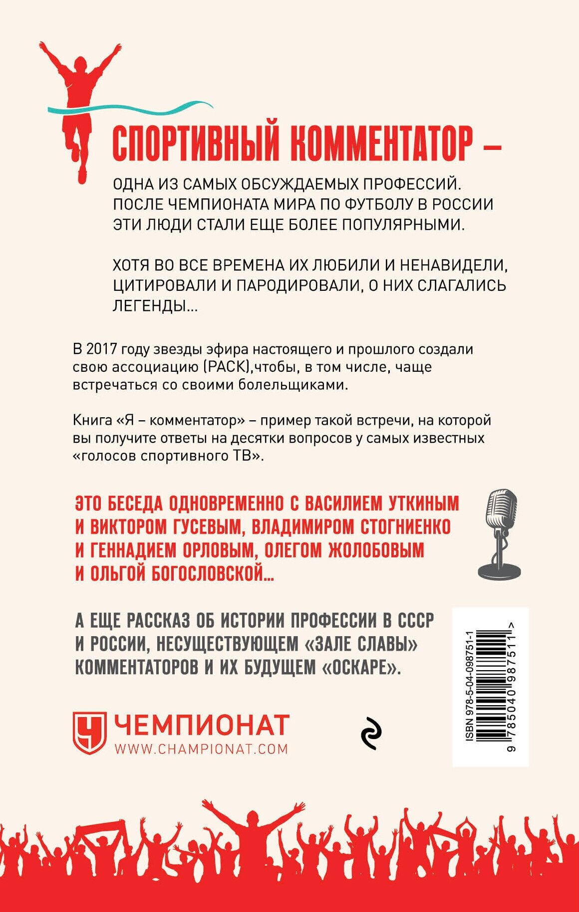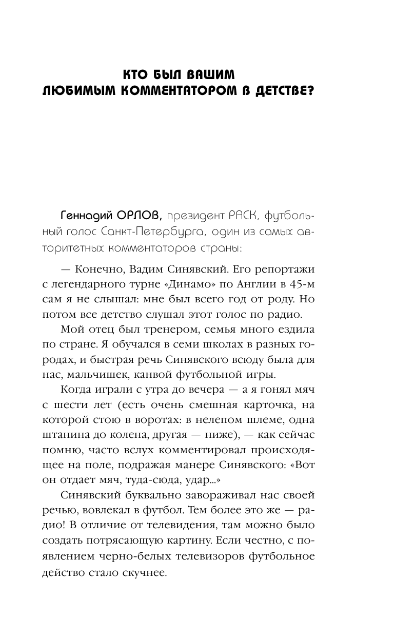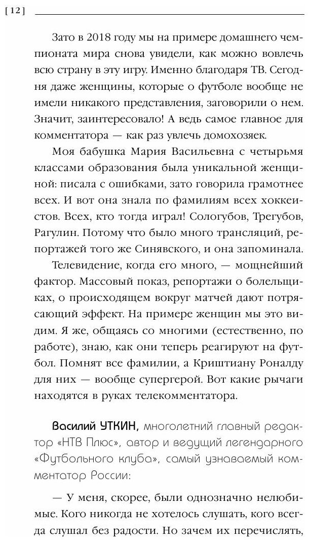 Спортивный комментатор - одна из самых обсуждаемых профессий. После чемпионата мира по футболу в России эти люди стали еще более популярными. Хотя во все времена их любили и ненавидели, цитировали и пародировали, о них слагались легенды... В 2017 году звезды эфира настоящего и прошлого создали свою ассоциацию (РАСК), чтобы, в том числе, чаще встречаться со своими болельщиками. Книга "Я - комментатор" - пример такой встречи, на которой вы получите ответы на десятки вопросов у самых известных "голосов спортивного ТВ". Это беседа одновременно с Василием Уткиным и Виктором Гусевым, Владимиром Стогниенко и Геннадием Орловым, Олегом Жолобовым и Ольгой Богословской... А еще рассказ об истории профессии в СССР и России, несуществующем "зале славы" комментаторов и их будущем "Оскаре".