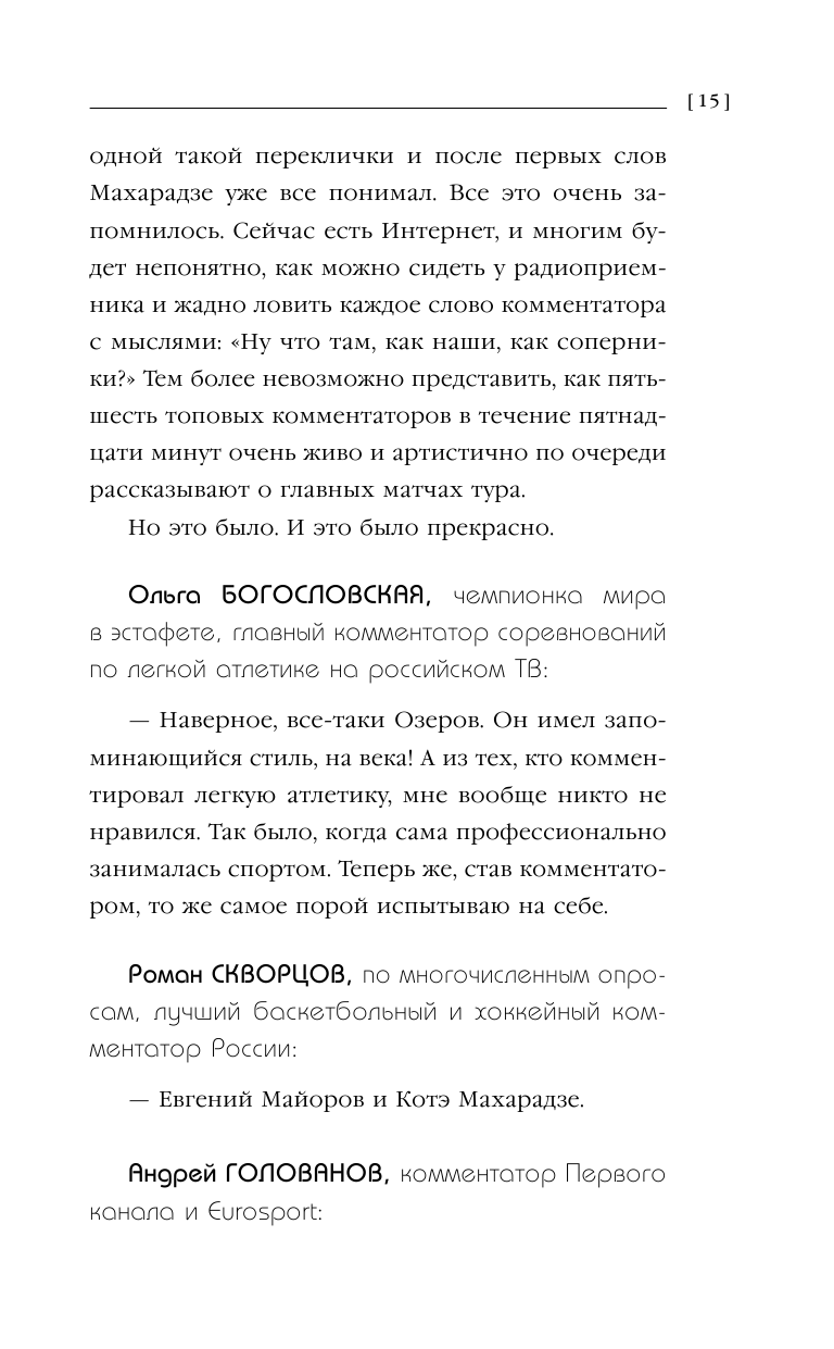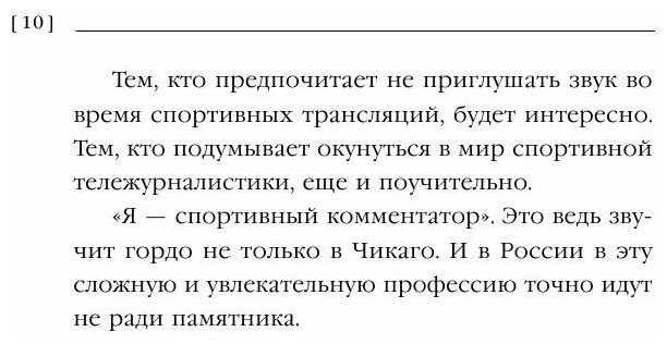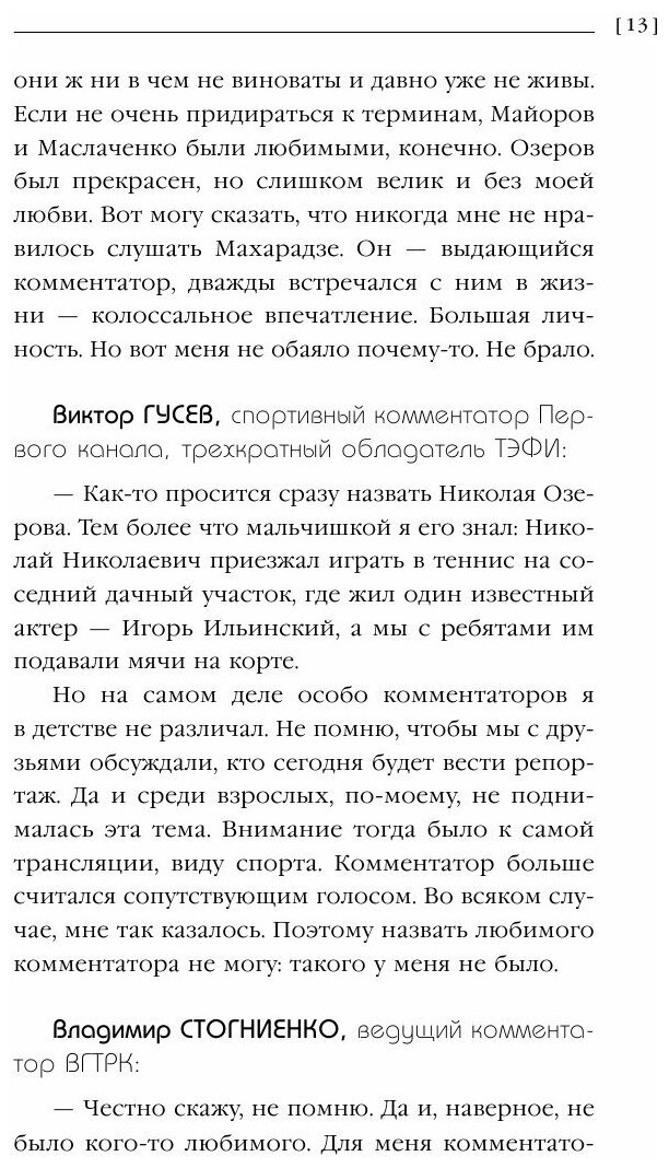 Люблю такой формат, когда несколько человек отвечают на один и тот же вопрос. Сразу появляется возможность узнать мнения людей, сравнить их и что-то выделить для себя. В этой книге речь идет о российских комментаторах спортивных соревнований. Здесь можно найти и советы начинающим комментаторам, и о личных предпочтения в спорте, и воспоминания о проведенных спортивных мероприятиях и т.д. Для тех людей, кого интересует внутренняя кухня этой профессии, книга будет интересна и поможет сформировать свое представление на основе ответов профессионал в данной сфере.