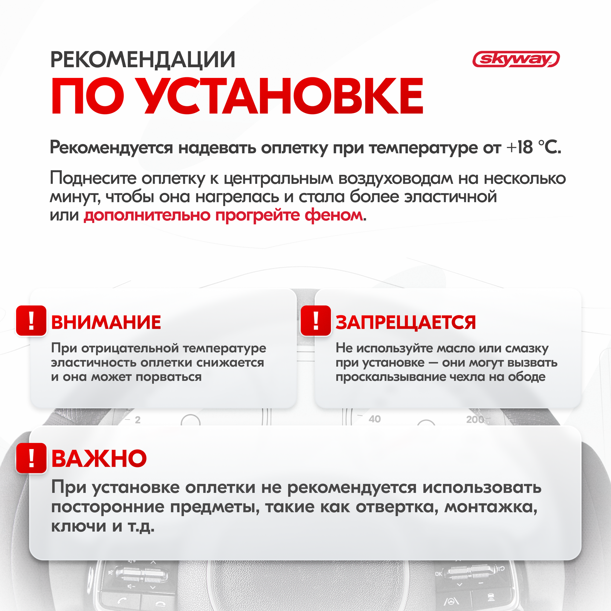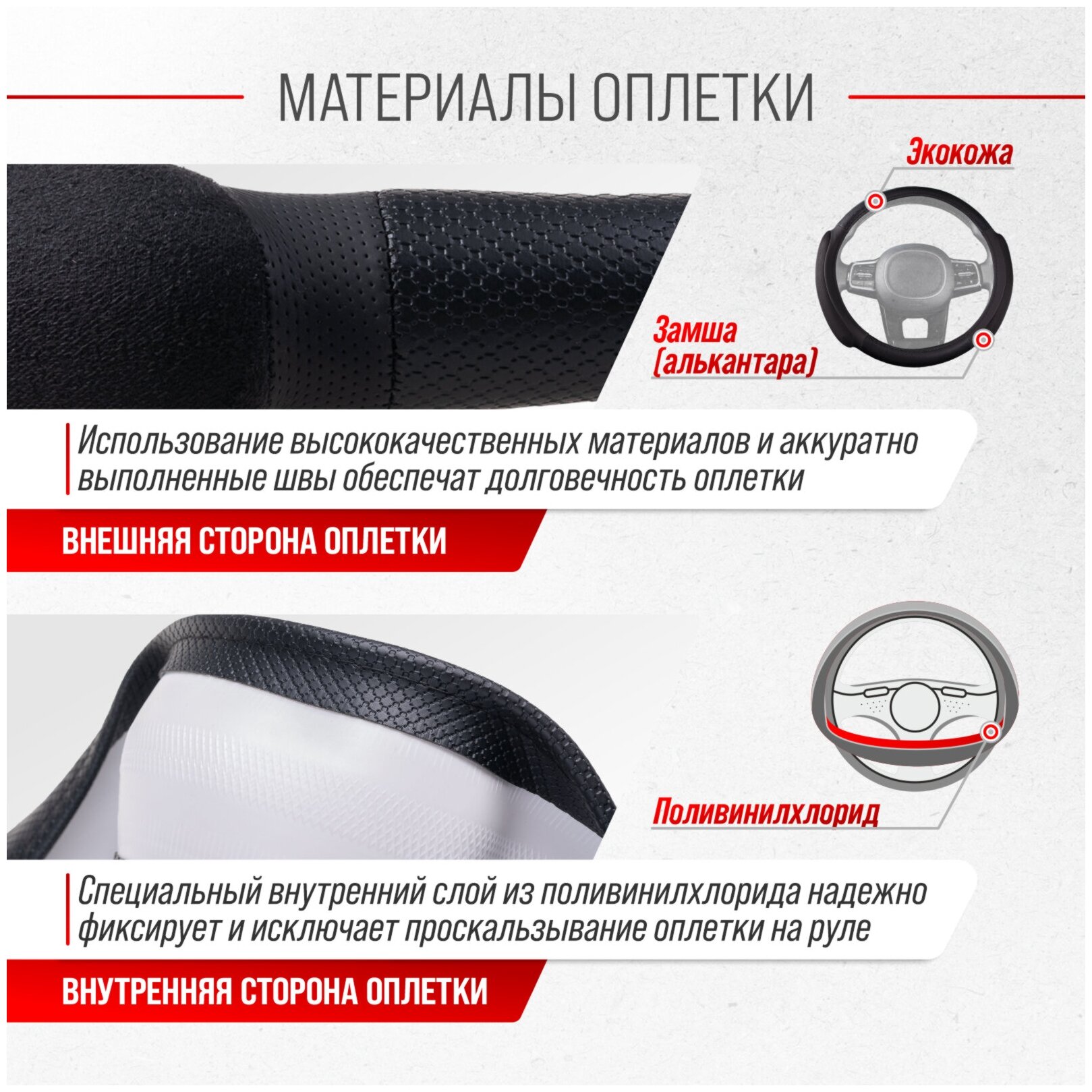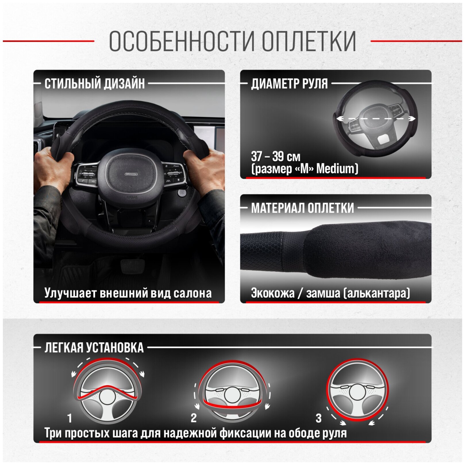 Оплетка на руль - сверхпопулярный автомобильный аксессуар. Сделана из высококачественного материала экокожа с вставками. Практичный черный цвет отлично вписывается в любой интерьер. Стильный дизайн выгодно подчеркнет хороший вкус автовладельца и его индивидуальность. Оплетка на руль Top-7 размера «M» подходит на 90% отечественных и зарубежных автомобилей. Чехол на руль автомобиля подойдет для Тойота, Гранта, Ларгус, Приора и многих других. На руль оплетка устанавливается легко, не требует долгих манипуляций, достаточно минимума усилий и предварительного нагрева для более легкого надевания. Поэтому справится даже хрупкая девушка.Внимание! Важно ознакомиться с последовательностью натягивания оплетки (см. слайд). Нагреть оплетку можно обычным феном, на солнце или горячим воздухом в машине.Тянется при установке, при этом отлично держит форму и плотно прилегает к рулю, повторяя его рельеф и изгибы. Вот почему чехол на руль автомобиля универсальный. Преимущества: износостойкая, без запаха, устойчива к царапинам и порезам.Чехол на руль с отменными рабочими характеристиками: скрывает имеющиеся потертости и царапины, уберегает от появления новых. Оплетка на руль не перегревается летом от солнечных лучей и не обжигает руки, а зимой не дубеет на морозе, не растрескивается, материал оплетки очень приятный на ощупь.За счет красивого внешнего вида чехол на руль автомобиля хорош как подарок девушке, как подарок мужчине в машину.Противоскользящий материал ПВХ с внутренней стороны гарантирует - оплетка не будет смещаться по ободу колеса, обеспечит крепкое сцепление с его поверхностью, что критично важно во время вращения руля.