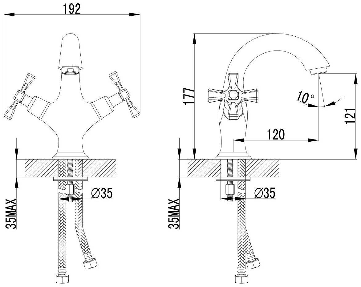 Комплектация: Аэратор Neoperl Cascade. Кран-буксы с керамическими пластинами (угол поворота - 180 градусов). Гибкая подводка 1/2" 35 см. Металлические рукоятки.
