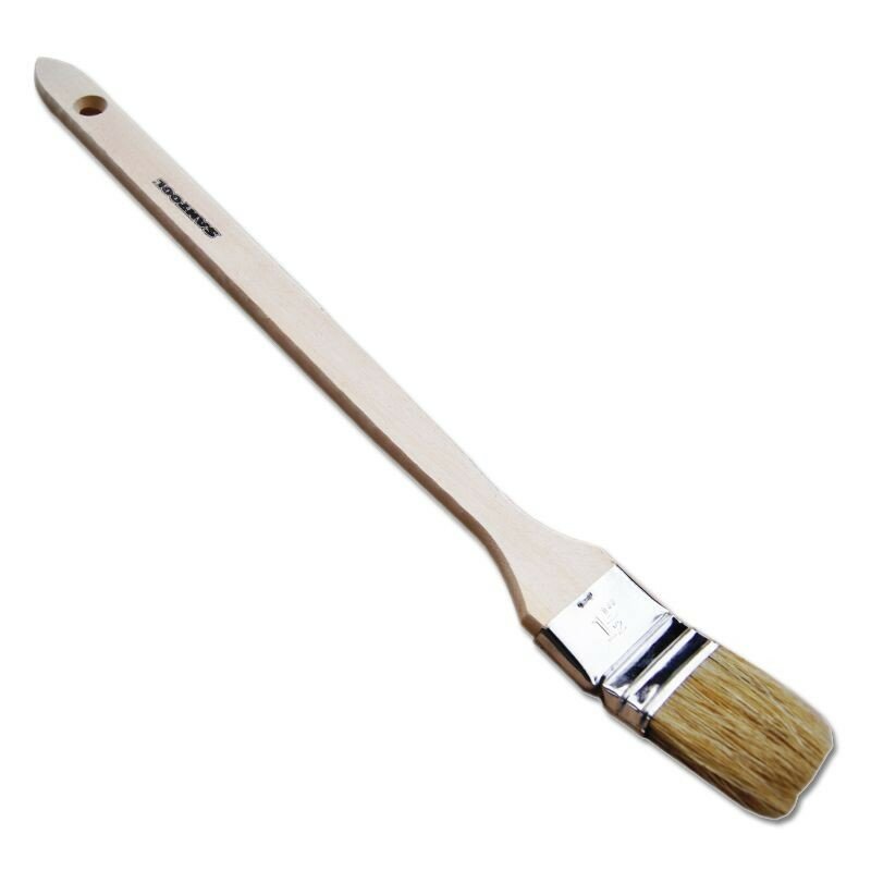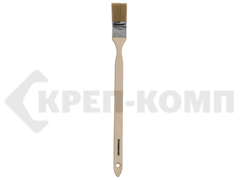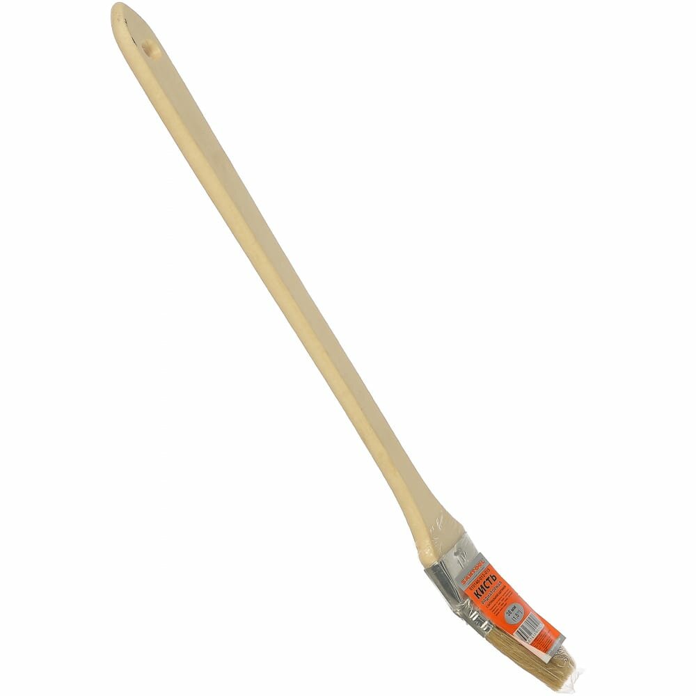 Ворс кисти из натуральной щетины двойной выварки. Щетина расщеплена на концах. Щетина кисти надежно закреплена металлическим бандажом с антикоррозийным покрытием. Деревянная ручка имеет удлиненную форму, не скользит в руке. Кисть применяется для выполнения малярных работ в труднодоступных местах (отопительные радиаторы, трубы, поверхности за радиаторами). Предназначена для работ с масляными красками и лаками, устойчива к агрессивным составам. Размер кисти 38 мм.