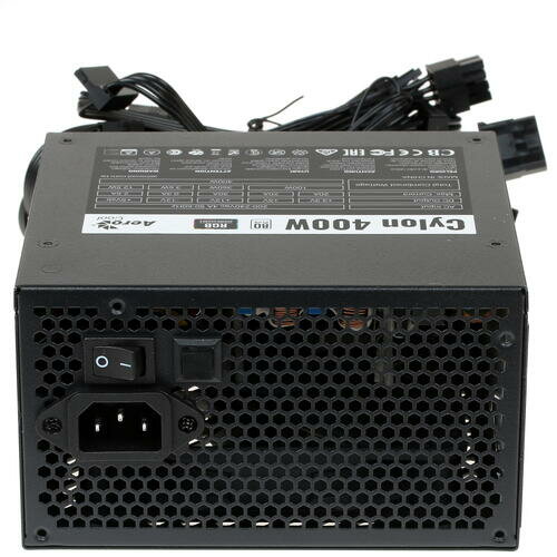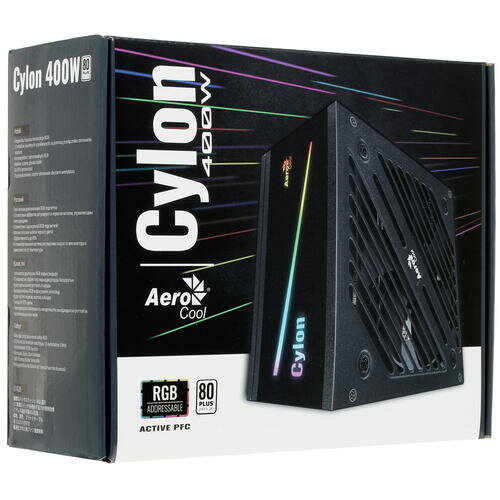 | Прочие особенности и свойства | Блок питания Aerocool Cylon 400W [4718009153332] станет надежным выбором для обеспечения стабильной работы домашнего или офисного компьютера. Отличительной особенностью модели является встроенная сертификат 80 Plus, который подтверждает высокий КПД устройства. Благодаря RGB-подсветке с широким выбором предустановленных вариантов освещения и возможности синхронизации с материнской платой данный модуль обеспечит превосходный внешний вид вашего системного блока.,Блок питания Aerocool Cylon 400W [4718009153332] выполнен в формате ATX с шириной 150 мм и высотой 86 мм. Модель оснащена вентилятором активного охлаждения на 120 мм и имеет 400 Вт номинальной мощности, а также 360 Вт по линии 12 В, что соответствует току 12V1 30A. Основной разъем питания имеет коннекторы (20+4)-pin, для процессора предусмотрен 1 выход (4+4)-pin, а для видеокарты — (6+2)-pin. Для питания дисков SATA предусмотрено 4 разъема 15 pin. Длина кабеля питания процессора составляет 55 см, основного кабеля — 50 см. Благодаря мягкой оплетке провода отличаются удобством сборки. |