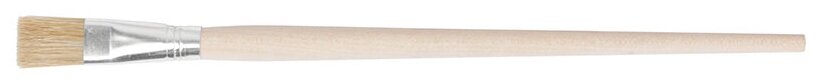 Плоская. Для работы со всеми видами лакокрасочных материалов. Натуральная светлая щетина, деревянная ручка.