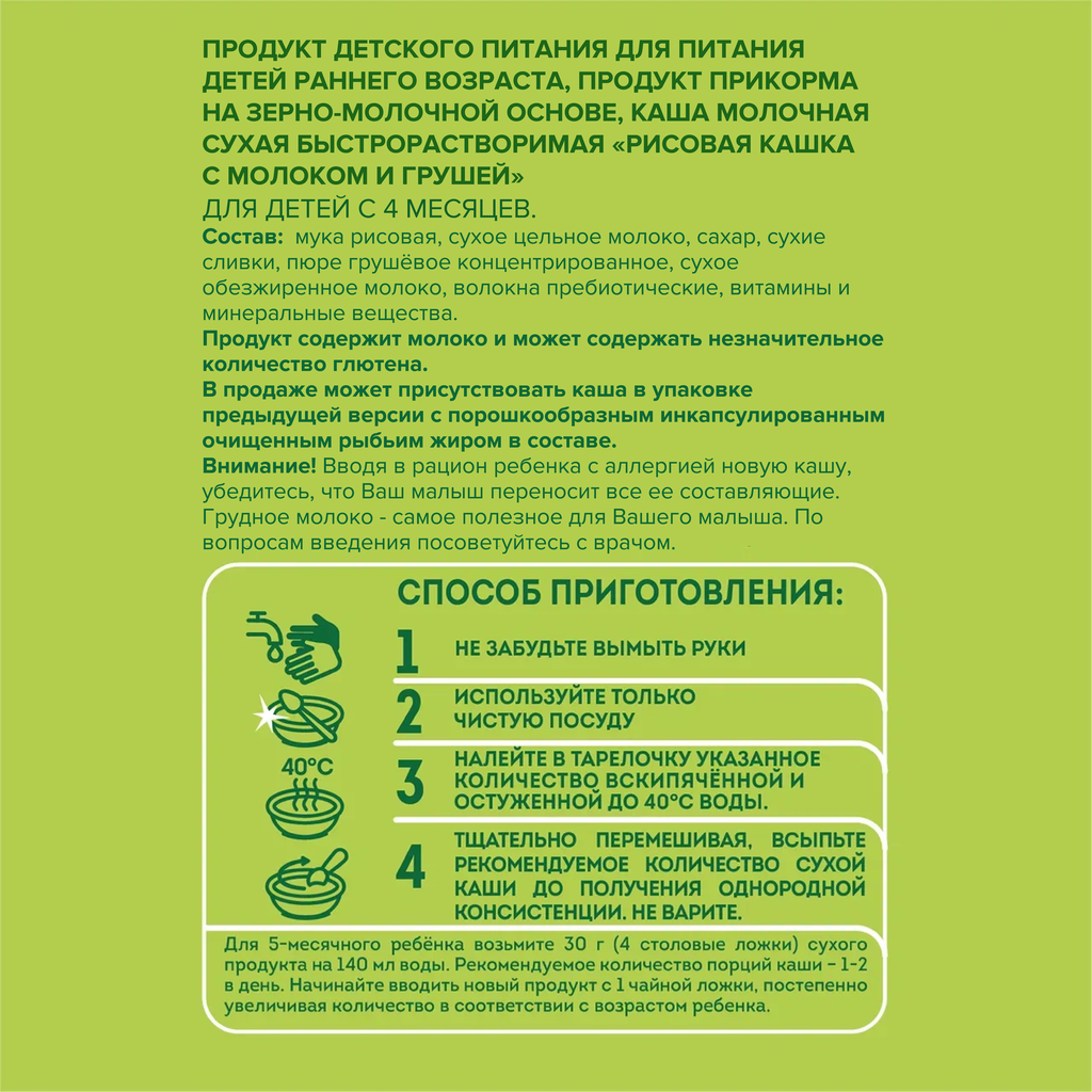 | Состав | рисовая мука, сухое цельное молоко, сахар, сухие сливки, пюре грушевое концентрированное, сухое обезжиренное молоко, пребиотические волокна цикория 2% (инулин), карбонат кальция, железо, окись цинка, йодистый калий, витамины |