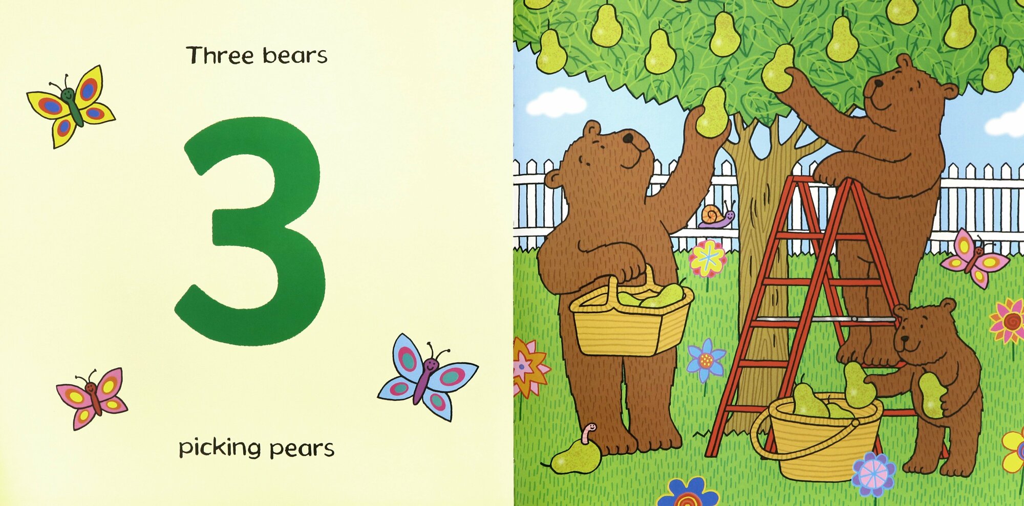 All the animals are busy lending a hand in the garden in this lively numbers book! The parrots are pulling up carrots, the bears are picking pears and a swarm of bees are pruning the trees with their miniature shears.
