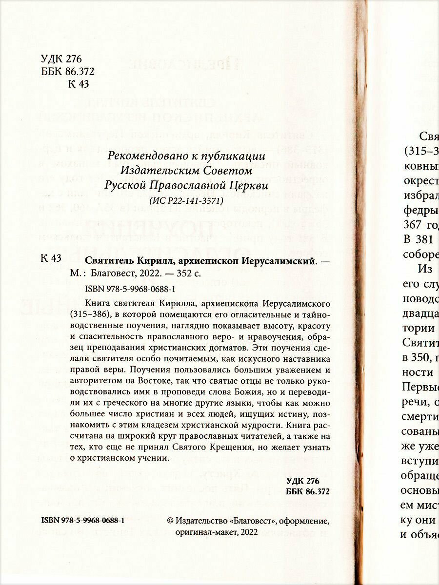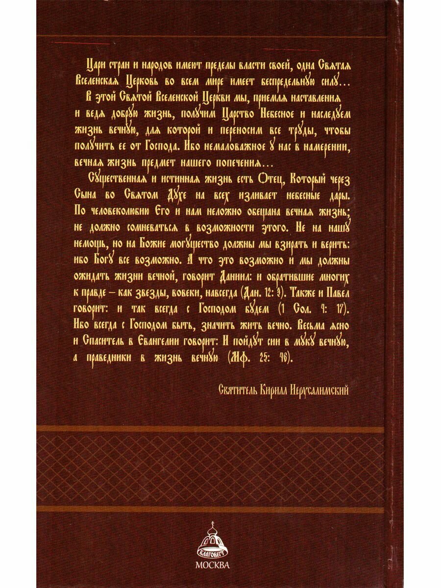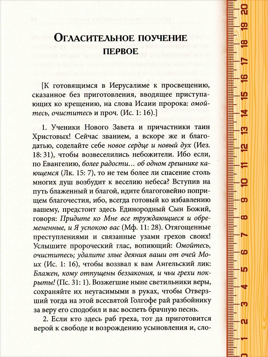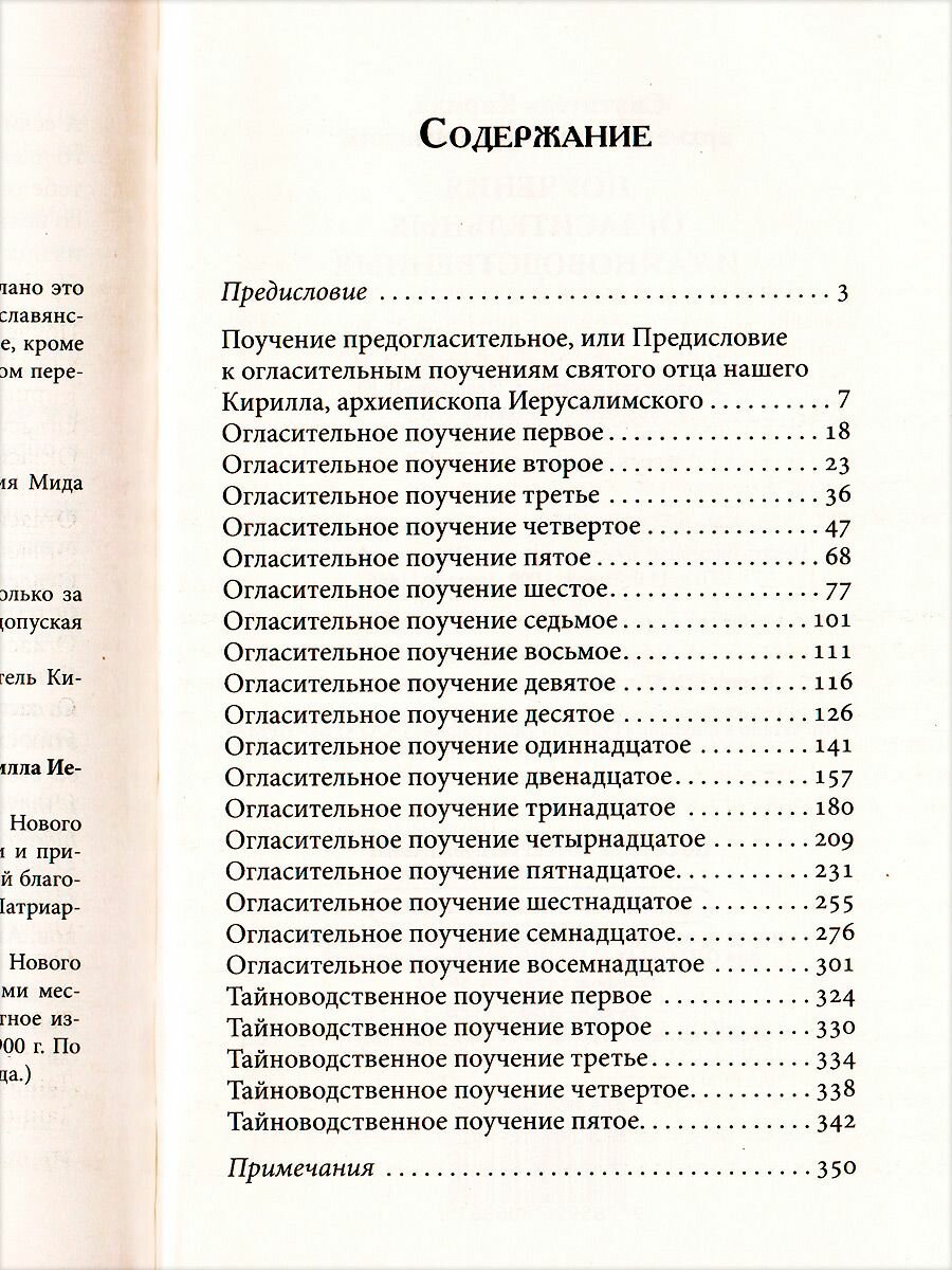 Книга святителя Кирилла, архиепископа Иерусалимского (315-386), в которой помещаются его огласительные и тайноводственные поучения, наглядно показывает высоту, красоту и спасительность православного веро- и нравоучения, образец преподавания христианских догматов. Эти поучения сделали святителя особо почитаемым, как искусного наставника правой веры. Поучения пользовались большим уважением и авторитетом на Востоке, так что святые отцы не только руководствовались ими в проповеди слова Божия, но и переводили их с греческого на многие другие языки, чтобы как можно большее число христиан и всех людей, ищущих истину, познакомить с этим кладезем христианской мудрости. Книга рассчитана на широкий круг православных читателей, а также на тех, кто еще не принял Святого Крещения, но желает узнать о христианском учении.