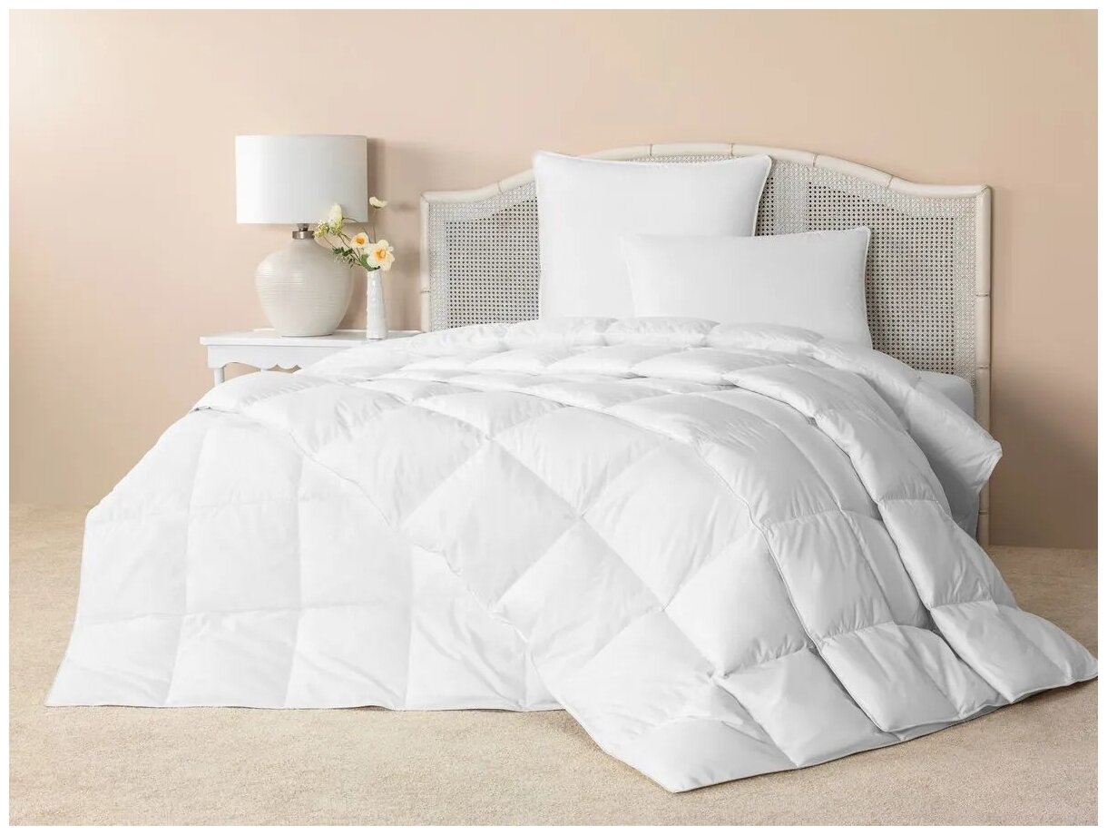 Стеганое одеяло из пуха коллекции «Аоста» размером 200*210 см имеет чехол 100% хлопка-батиста, наполнитель 100% Гусиный пух и массу наполнителя 800 гр.