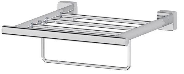 Очень популярная позиция для использования в гостиничных номерах, т.к. она дает возможность складывать стопкой чистые полотенца различных размеров, а также размещать их для просушки. Нижний подвижный держатель удобен для просушивания тяжелого банного полотенца.