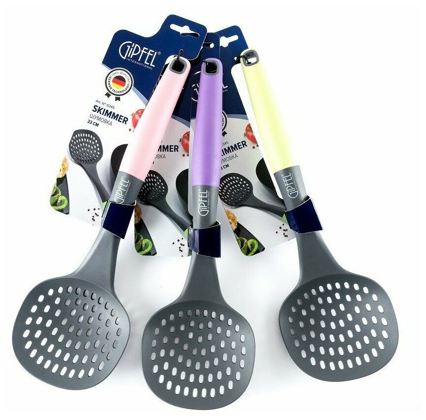 Шумовка GIPFEL 6345. Длина 33 см. Покрытие ручки "Soft-touch". Шумовка имеет пластиковую ручку с петлей для подвешивания. Рабочая поверхность из нейлона, что позволит использовать шумовку с антипригарной посудой.