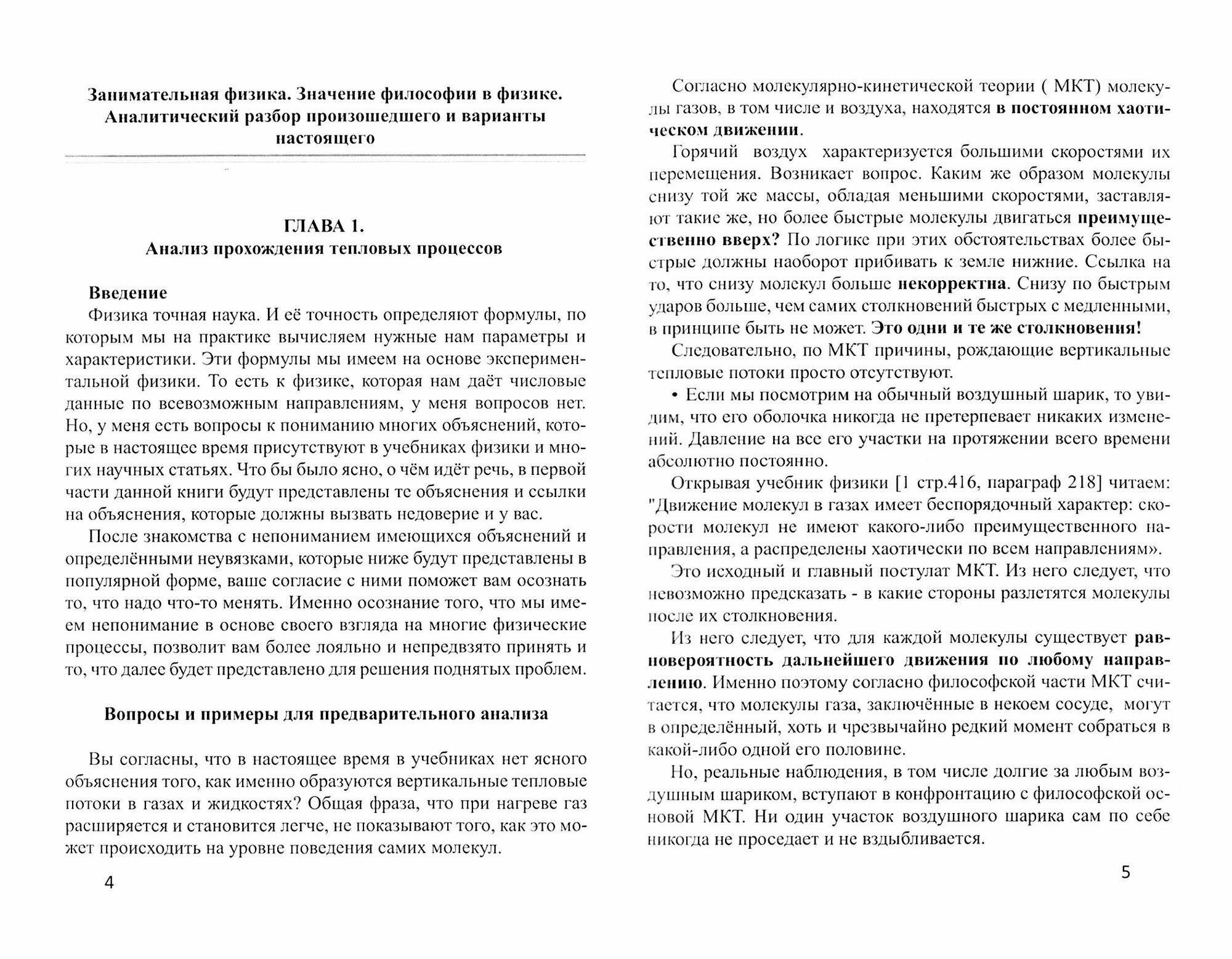Данная книга имеет рецензии - одна от к.ф.-м.н., ассоц. профессора, другая от академика докт. тех. наук. В данной книге на конкретных примерах представлена важность философской составляющей в развитии физики и к чему может привести пренебрежение к ней; представлены объяснения тепловых процессов с новым видением механизма энтропии, причин броуновского движения и того как работает механизм теплоёмкости; на уровне взаимодействия молекул представлен механизм формирования тепловых вертикальных потоков; рассматриваются единые силы организующие процессы сорбции, смачивания и участвующие в образовании поверхностной плёнки у жидкостей. Прочтя эту книгу, многие поймут то, что не понимали в физике со школы, а также узнают причину своего непонимания.