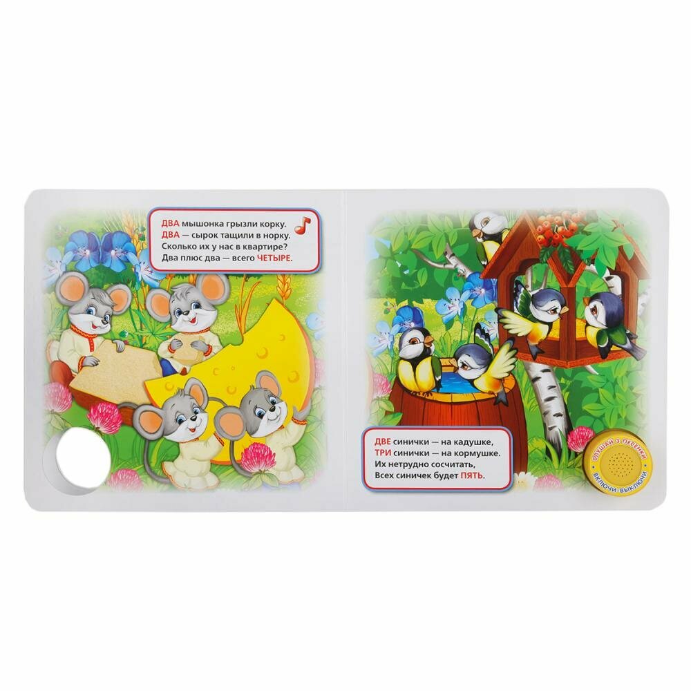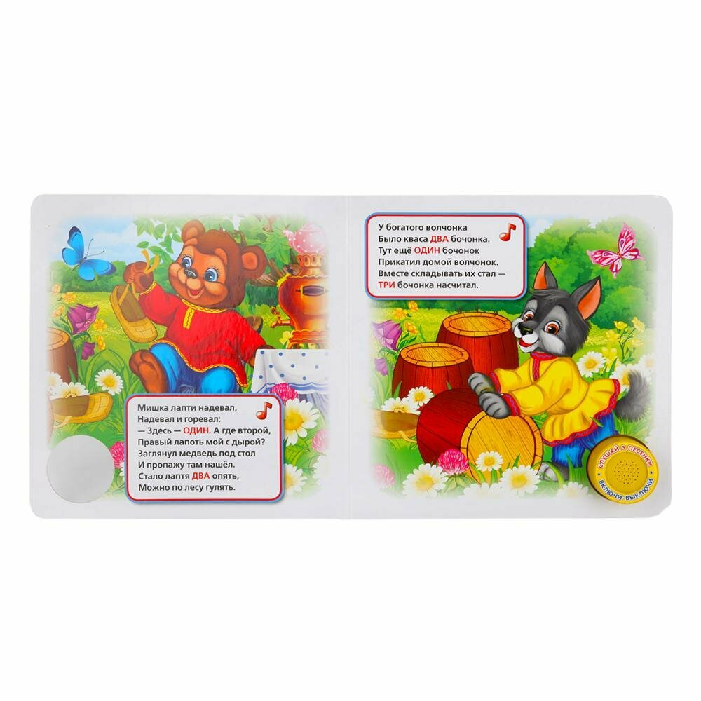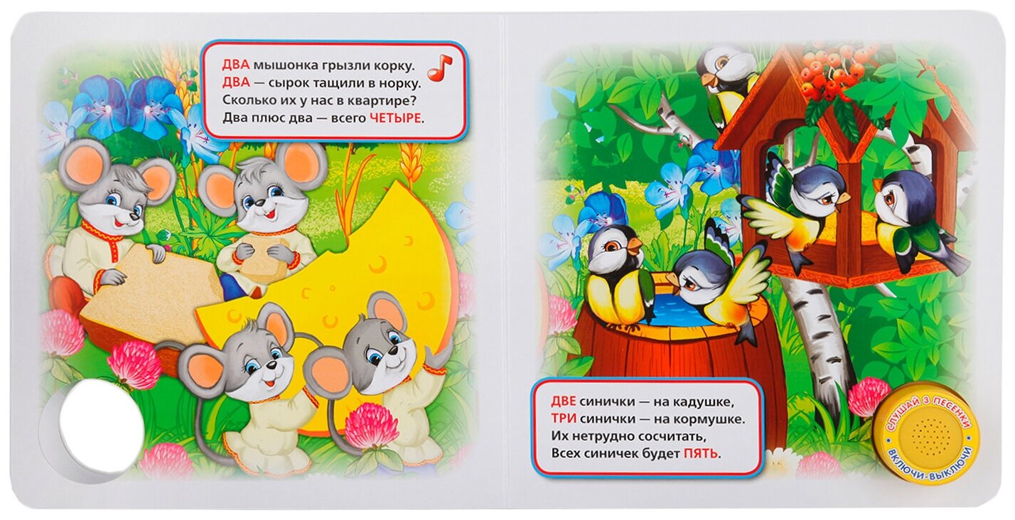 Компактная книга из прочного безопасного картона с кнопкой для прослушивания. Любимые авторы, народные фольклор, истории по мультфильма, и конечно, 3 песенки!