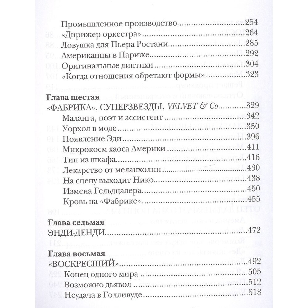 Книга захватывает все периоды жизни Уорхола. Автор анализирует, сравнивает его творческий, и не только, путь с другими яркими представителями разных эпох. Поэтому иногда текст уходит от Энди и пускается в небольшие рассказы о других людях. Порой это становится занудным и бессмысленным, но все же это не такое и частое явление в этой книге.