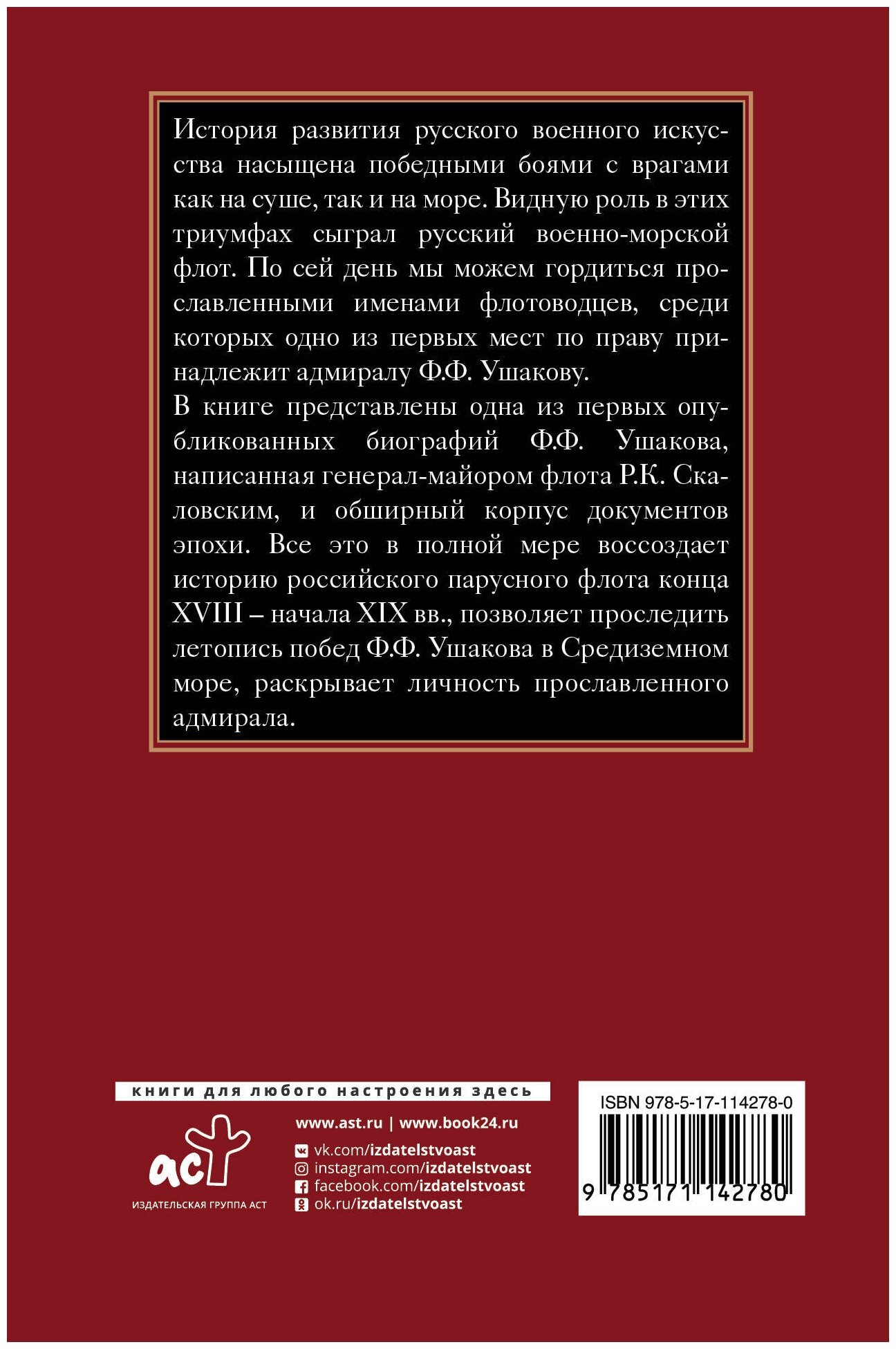 В книге хронологически первая биография великого адмирала, написанная в конце девятнадцатого века известным офицером флота Скаловским Ростиславом Карповичем - активным участником русско-турецких войн и одним из создателей русского броненосного флота. Это я указываю на ошибку в аннотации про "историю парусного флота начала 20 века". Автор как раз в конце 19 века, будучи чиновником Морского министерства, организовал переход флота к кораблям нового типа - тогда ещё лишь бронепалубным крейсерам. Будучи человеком талантливым, в том числе и как писатель, создал эту книгу, отдавая дань памяти знаменитому Ушакову - образцу государева служаки и христианского воина.