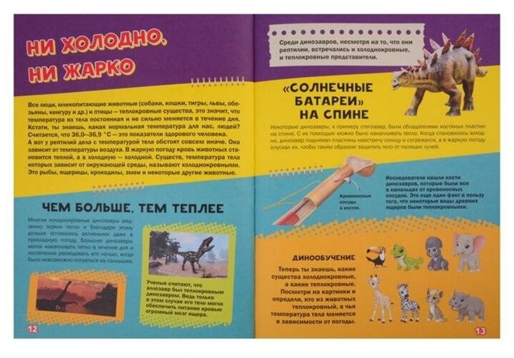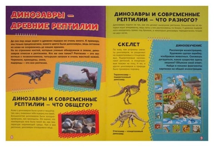на одном развороте представлена информация про одного динозавра. есть диноразвлечения- задания для детей. самой информации про динозавров могло бы быть больше.