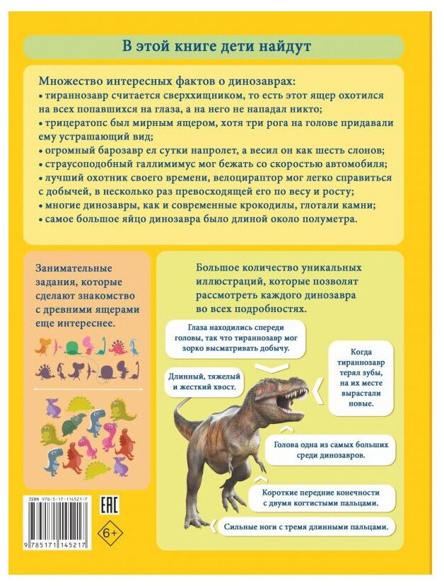 Настоящее издание познакомит маленьких читателей с необычными животными, когда-то населявшими планету. Внешний вид, образ жизни, питание, регионы обитания разных видов динозавтров и причины их исчезновения - эта и другая не менее интересная информация содержится на страницах нашей книги. А еще - множество красочных реалистичных иллюстраций и занимательных заданий, чтобы ребята в игровой форме могли лучше усвоить прочитанный материал о древних ящерах. Именно для этого предусмотрены рубрики Динообучение, Диноразвлечение и Динофакты. Так что знакомиться с таинственными динозаврами, имея под рукой эту книгу, будет не только полезно, но и очень увлекательно.