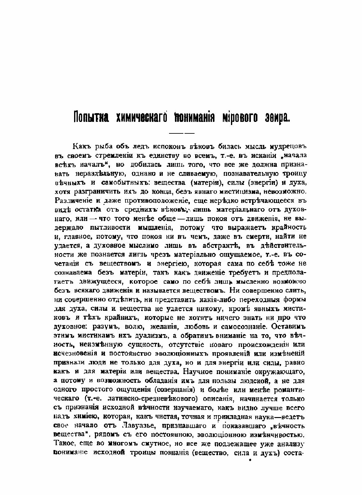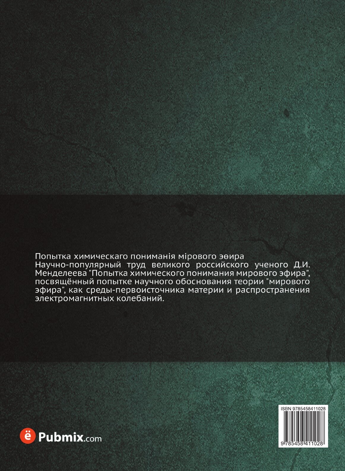 Попытка химическаго пониманiя мiрового эѳираНаучно-популярный труд великого российского ученого Д.И. Менделеева "Попытка химического понимания мирового эфира", посвящённый попытке научного обоснования теории "мирового эфира", как среды-первоисточника материи и распространения электромагнитных колебаний.