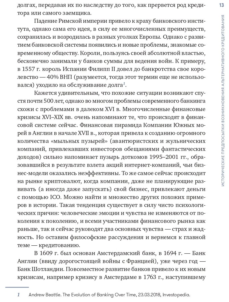 Как сохранить баланс между доходностью и относительной безопасностью своих вложений? Одно из возможных решений вы найдете в этой книге. Она посвящена новому виду активов – альтернативному кредитованию, в котором инвесторы и заемщики взаимодействуют напрямую на технологичных платформах без привлечения банков в качестве посредников. Автор книги одним из первых в нашей стране нашел способ инвестировать в подобные займы и сейчас предоставляет такую возможность и другим российским инвесторам. Вы узнаете об истории альтернативного кредитования, его видах на рынке, о том, как работают основные платформы и как стать их участникам в качестве инвестора или заемщика. А самое главное, вы сможете понять, по каким критериям выбрать надежный фонд для инвестиций и как инвестировать в займы на этих платформах, стабильно получая 6–9% годовых.
