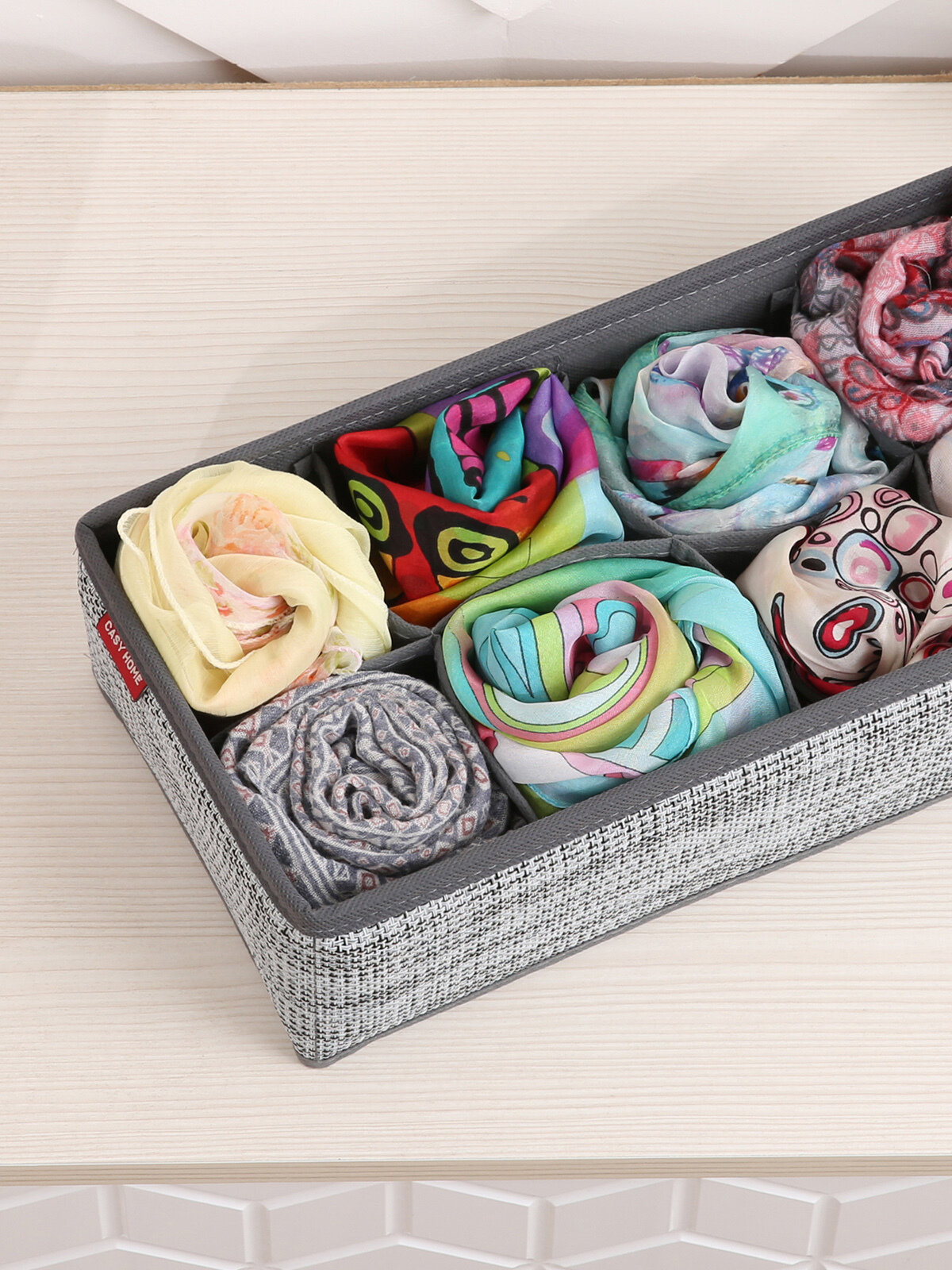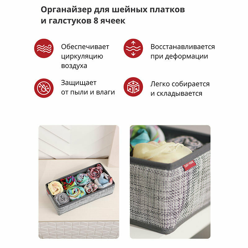 Удобный органайзер для шейных платков и галстуков поможет не запутаться в разнообразии аксессуаров и сохранить порядок в шкафу. Прочный каркас из ячеистого полипропилена легко собирается. Внешняя сторона органайзера выполнена из текстилена, а подкладка - из спанбонда. Эти современные материалы не впитывают влагу, отлично пропускают воздух и при этом защищают от пыли.