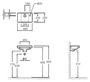 Подвесная прямоугольная раковина. Отверстия для смесителя - 1, расположение справа. Материал: фаянс. Размеры 40x25 см. Цвет белый.