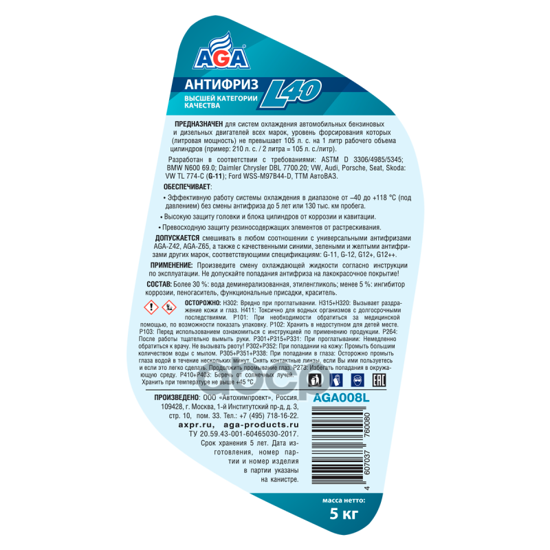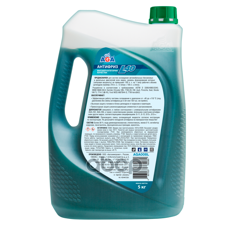 Антифриз AGA-L40 предназначен для систем охлаждения бензиновых и дизельных двигателей легковых и грузовых автомобилей всех марок (иностранных и российских). Идеален для высокофорсированных двигателей, в том числе с турбонаддувоми охладителем наддувочного воздуха (интеркулером).