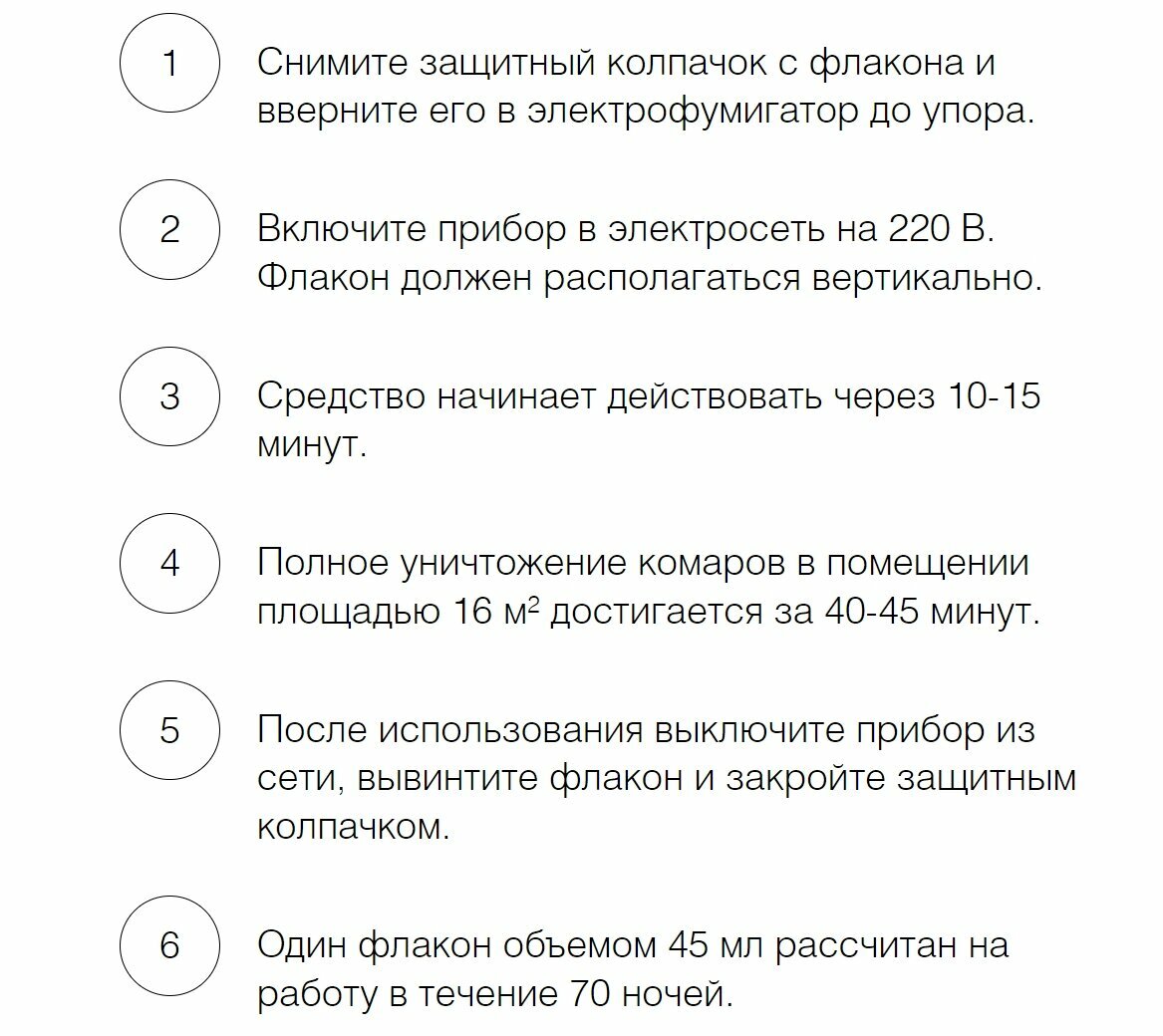 | Инструкция по применению | Вынуть из упаковки флакон с раствором, снять защитный колпачок, ввернуть флакон в нагреватель до упора и включить его в электросеть на 220 В при вертикальном положении флакона. Полное уничтожение комаров достигается менее чем за 1 час. При открытых окнах или форточках электрофумигатор с флаконом можно оставлять включенным на всю ночь. Нагреватель выключить, флакон вывинтить, закрыть защитным колпачком и сохранять до следующего использования. Один флакон объемом 30 мл рассчитан на работу в течении примерно 360 часов. |