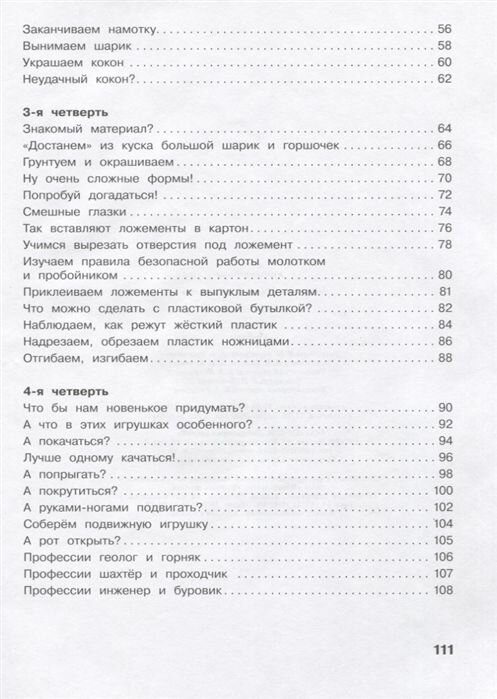 Содержание учебника учитывает требования ФГОС к результатам образования: организация рабочего места, соблюдение техники безопасности, понимание условных обозначений, выполнение технологических операций, анализ устройства изделий и изготовление их по образцу и с творческими изменениями, составление орнаментов, композиций, использование симметрии, знание основных свойств материалов, распространенных профессий, народных промыслов России, работа с информацией в разных формах и др.
