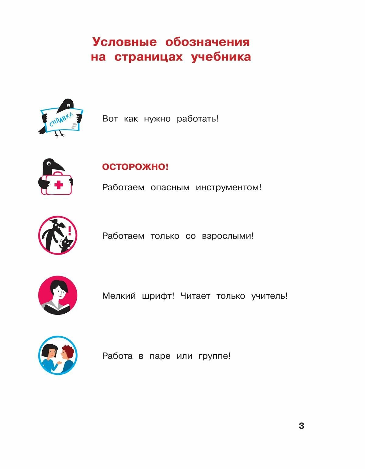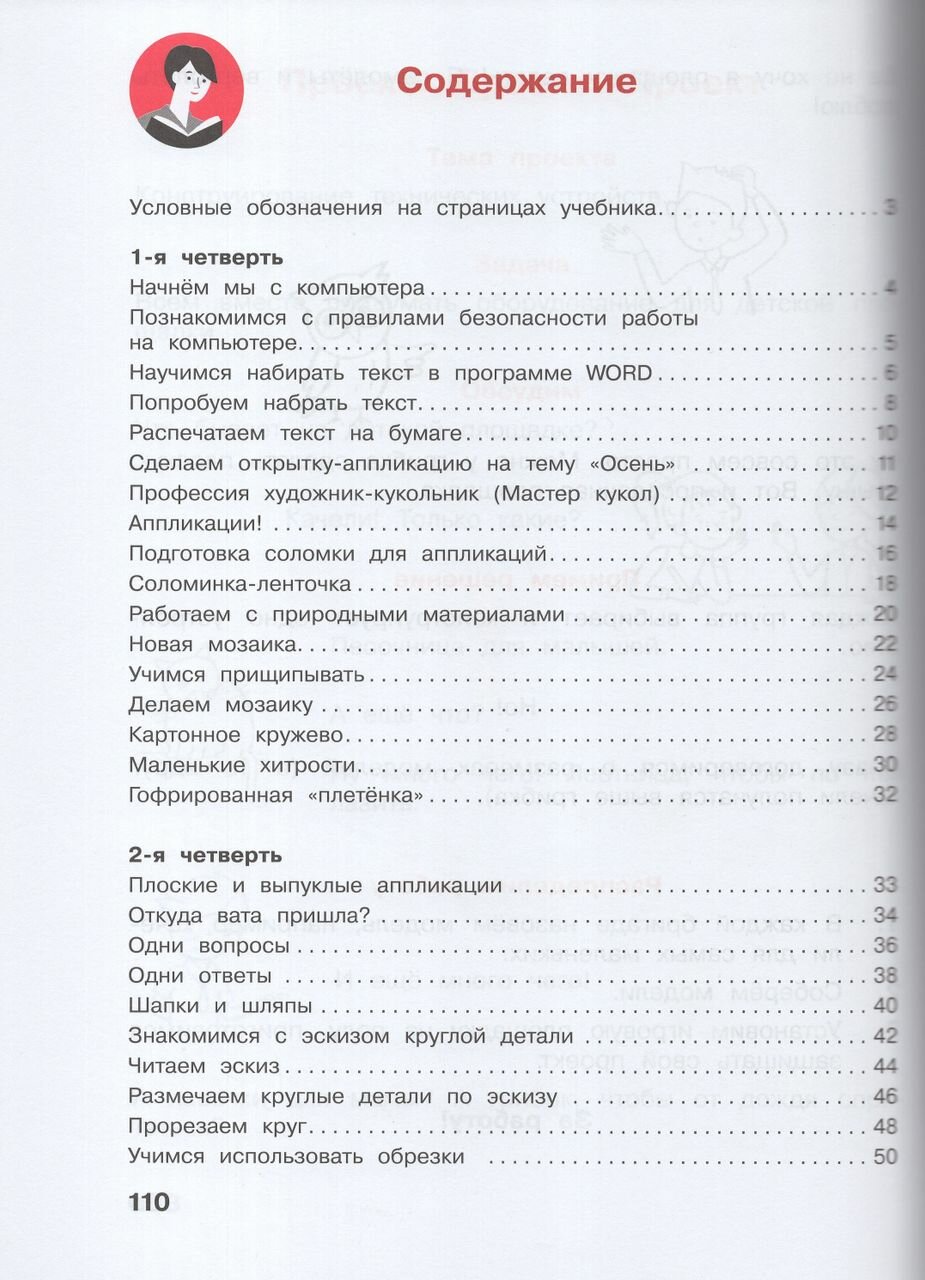 Содержание учебника учитывает требования ФГОС к результатам образования: организация рабочего места, соблюдение техники безопасности, понимание условных обозначений, выполнение технологических операций, анализ устройства изделий и изготовление их по образцу и с творческими изменениями, составление орнаментов, композиций, использование симметрии, знание основных свойств материалов, распространенных профессий, народных промыслов России, работа с информацией в разных формах и др.