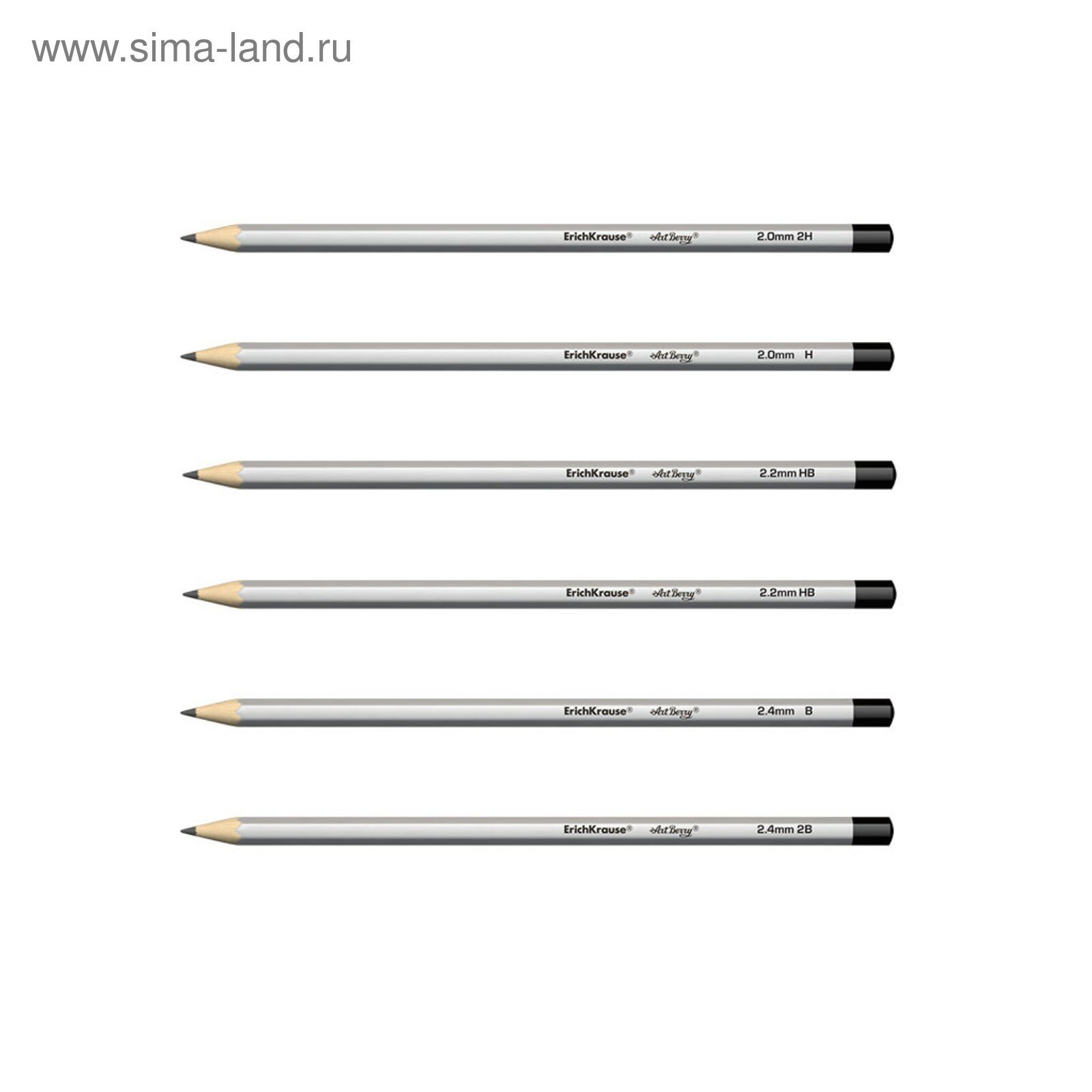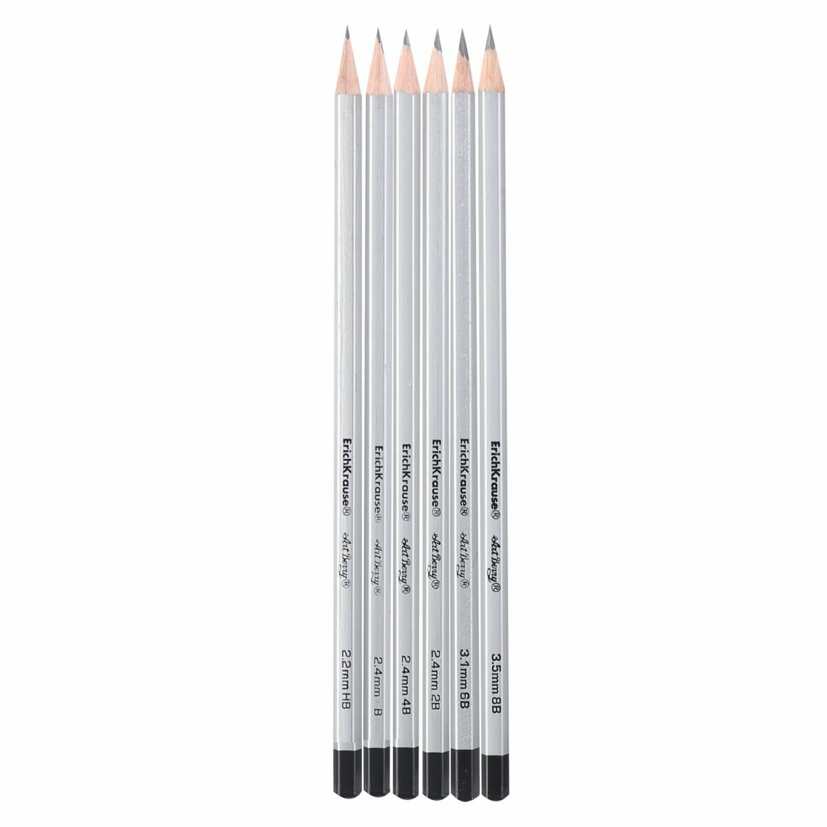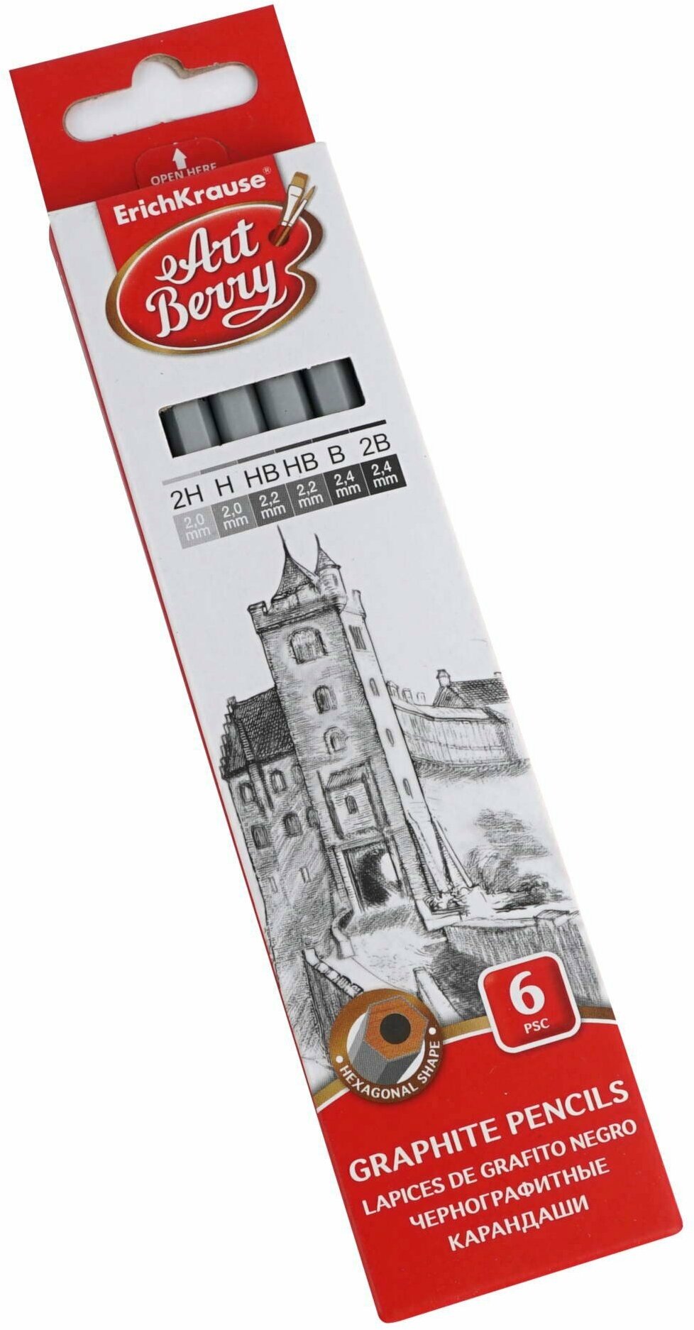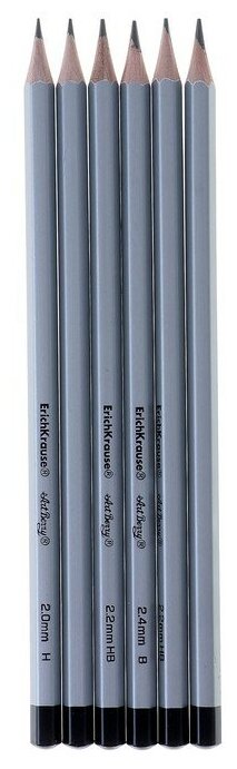 Классические шестигранные чернографитные карандаши различной степени твердости. Рекомендуются для выполнения художественных работ, графических зарисовок и чертежей. Грифель диаметром 2,2мм не царапает бумагу и не крошится. Насыщенность каждого графитового оттенка зависит от степени его жёсткости. Специальная пропитка древесины и сплошная проклейка грифеля обеспечивает высокую ударопрочность. Мягкая древесина и идеальная центровка грифеля гарантируют легкую заточку с экономным расходом карандаша. В наборе 2H, H, HB, HB, B, 2B.