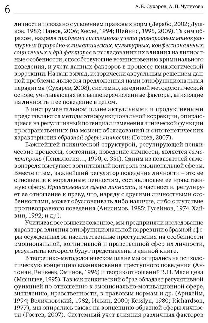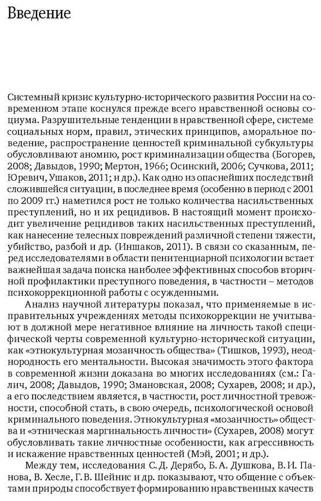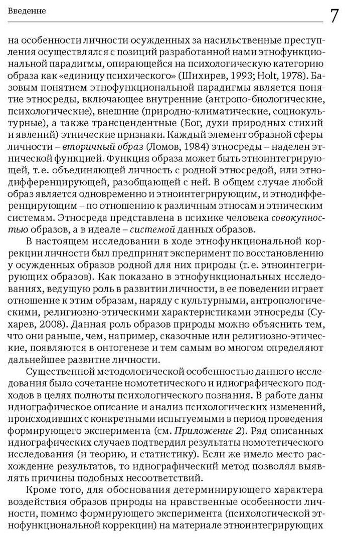 В книге впервые приведены результаты применения этнофункциональной парадигмы в области пенитенциарной психологии, а именно - метода этнофункциональной коррекции образной сферы личности осужденных за насильственные преступления с целью профилактики рецидивов. Экспериментально доказана возможность снижения с его помощью выраженности ряда эмоциональных и когнитивных особенностей личности, способствующих возникновению криминального поведения. В процессе этнофункциональной коррекции у осужденных формируется положительное отношение к заповедям Закона Божьего, к праву. Существенную методологическую и методическую особенность данного исследования составляет сочетание номотетического и идиографического подходов. Приведены идиографические описания и анализ психологических изменений, происходивших с конкретными испытуемыми в период проведения психологической коррекции. Обоснование детерминирующего характера воздействия образов родной природы (этноинтегрирующих) на нравственную и другие сферы личности подкреплено не только прямыми, но и "обратными" экспериментальными доказательствами: приведены и проанализированы также и результаты коррекции с использованием экзотических (этнодифференцирующих) образов природы. Книга может быть полезна психологам-практикам, работающим в уголовно-исполнительной системе, педагогам, школьным психологам, психологам - студентам вузов и научным сотрудникам.
