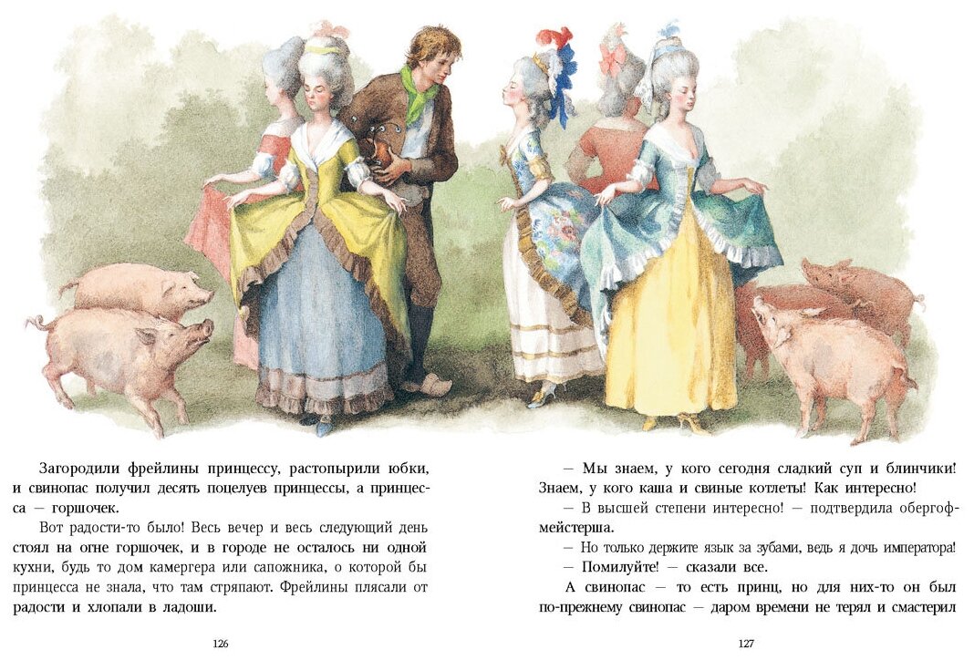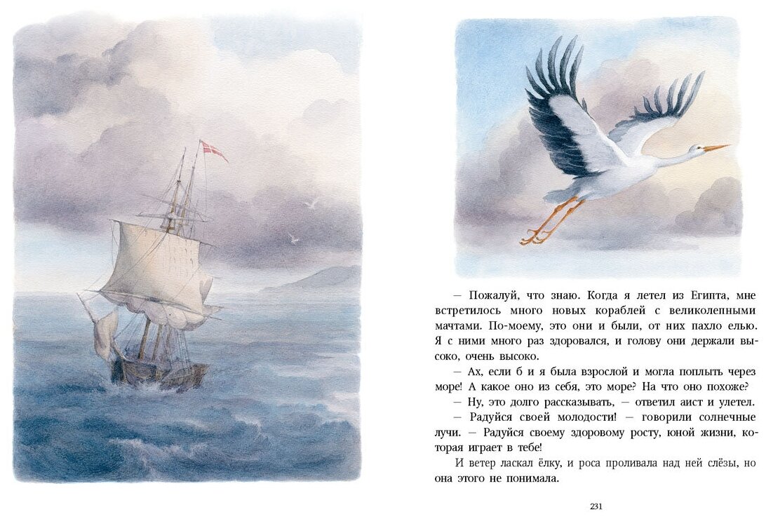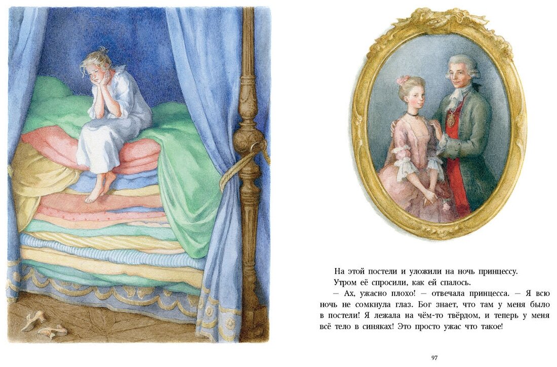 Сказки Андерсена, оформленные художницей Анастасией Архиповой, настраивают на долгое чтение. Хорошо известные, не один раз прочитанные истории вдруг начинают играть новыми красками, обогащаются интересными деталями. Можно полюбоваться изогнутыми в стиле рококо ножками стола и стульев, рассмотреть изысканные модели королевских туфель, сравнить узоры на атласных платьях фрейлин, изучить устройство огромной железной печи с несколькими заслонками… А ещё нежные, переливающиеся тонкими красочными нюансами акварели художницы передают немного печальное настроение и мечтательность сказок главного детского волшебника Ганса Христиана Андерсена.