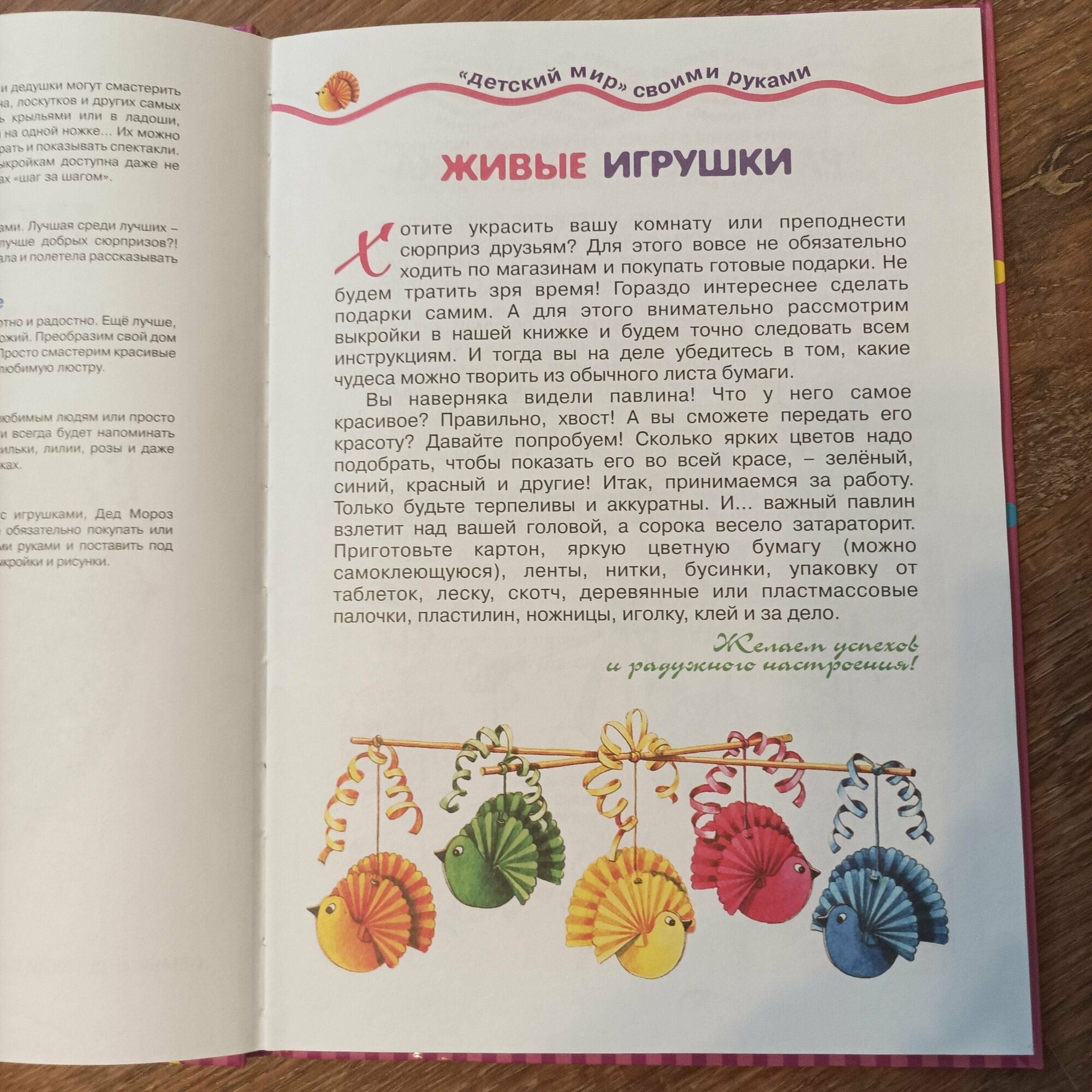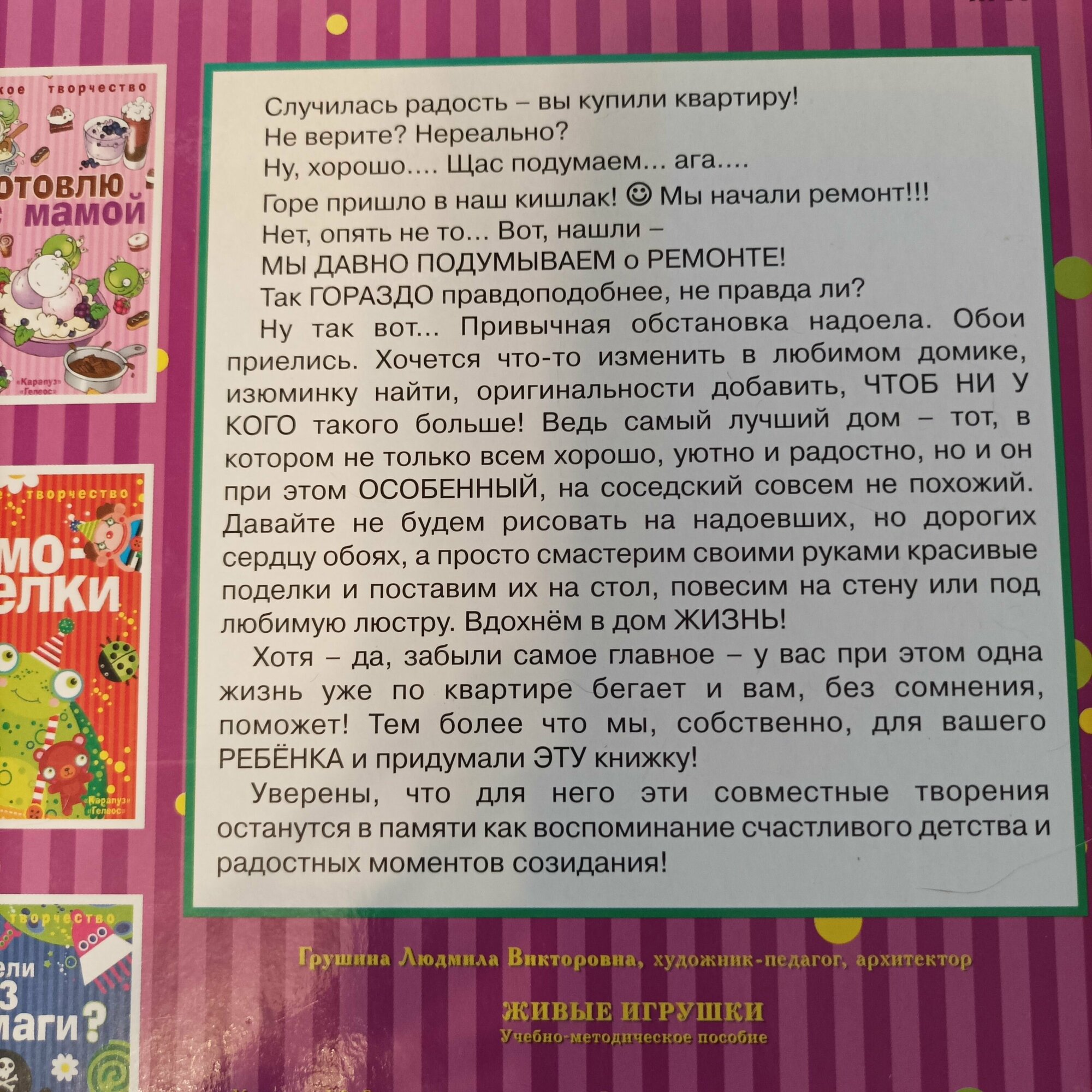 Случилась радость - вы купили квартиру! Не верите? Нереально? Ну, хорошо.... Щас подумаем... ага.... Горе пришло в наш кишлак! © Мы начали ремонт!!! Нет, опять не то... Вот, нашли - МЫ ДАВНО ПОДУМЫВАЕМ о РЕМОНТЕ! Так ГОРАЗДО правдоподобнее, не правда ли? Ну так вот... Привычная обстановка надоела. Обои приелись. Хочется что-то изменить в любимом домике, изюминку найти, оригинальности добавить, ЧТОБ НИ У КОГО такого больше! Ведь самый лучший дом - тот, в котором не только всем хорошо, уютно и радостно, но и он при этом ОСОБЕННЫЙ, на соседский совсем не похожий. Давайте не будем рисовать на надоевших, но дорогих сердцу обоях, а просто смастерим своими руками красивые поделки и поставим их на стол, повесим на стену или под любимую люстру. Вдохнем в дом ЖИЗНЬ! Хотя - да, забыли самое главное - у вас при этом одна жизнь уже по квартире бегает и вам, без сомнения, поможет! Тем более что мы, собственно, для вашего РЕБЕНКА и придумали ЭТУ книжку! Уверены, что для него эти совместные творения останутся в памяти как воспоминание счастливого детства и радостных моментов созидания! Книга "Живые игрушки" выпущена в издательстве "Карапуз" в 2008 году.