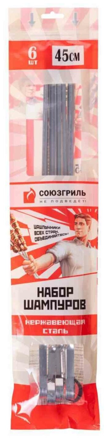 Набор шампуров 6 штук предназначен для приготовления шашлыков из мяса, птицы, рыбы и овощей. Шампуры Союзгриль надёжны, так как упругий металл выдерживает вес крупных кусков. Удобная ручка-винт фиксирует шампур на мангале.
