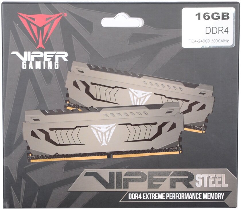 Модуль памяти Patriot Viper Steel , объем 2 х 8Gb, форм-фактор DIMM 288-pin, тип памяти DDR4, рабочая частота 3000MHz, тайминги 16-18-18-36, unbuffered