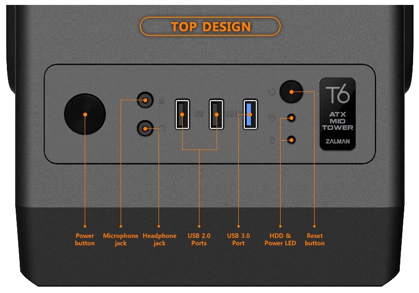 Корпус Zalman изготовлен из качественной стали. На лицевой панели корпуса размещены два порта USB 2.0 и один 3.0, а также разъемы для подключения наушников и микрофона. Функциональность и элегантный дизайн – все это совмещает в себе данный корпус.