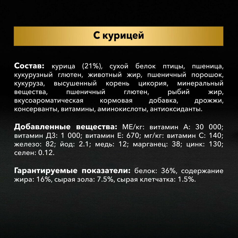 | Состав | Курица (20%), сухой белок птицы, рис, пшеничный глютен, кукурузный глютен, животный жир, кукуруза, кукурузный глютен, концентрат белка гороха, яичный порошок, витамины и минеральные вещества, вкусоароматическая кормовая добавка, рыбий жир, молозиво (0,1%) |