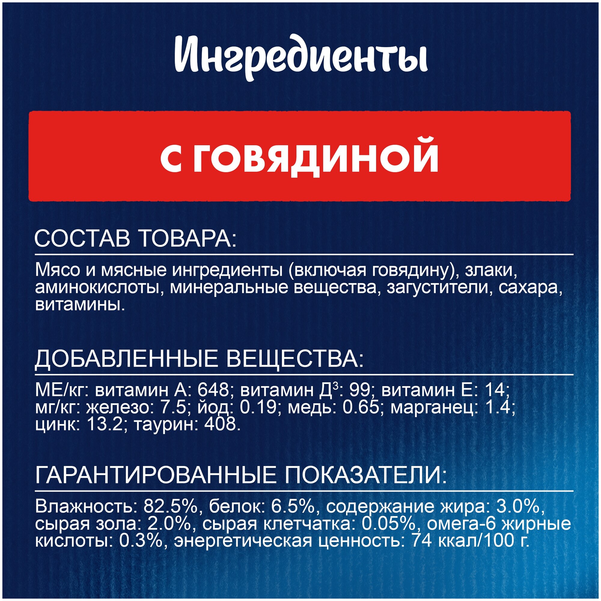 | Состав | Состав товара: мясо и продукты его переработки (из которых говядина 4%), злаки, аминокислоты, минеральные вещества, загустители, сахара, витамины. |