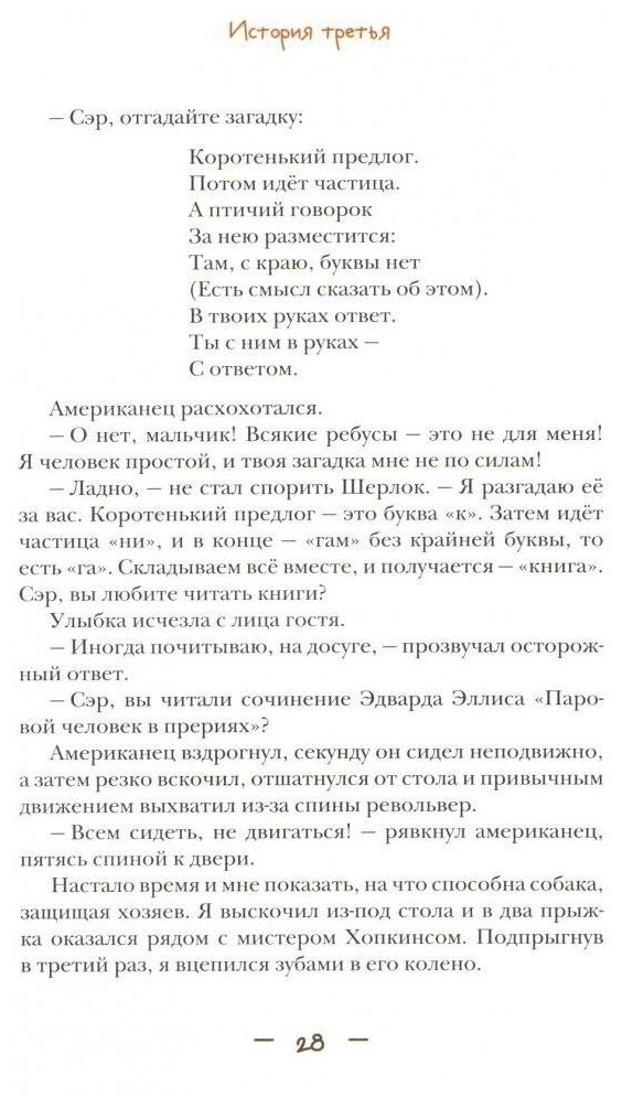 Джон Гаф, верный пёс мальчика по имени Шерлок Холмс (он станет знаменитым сыщиком, когда вырастет), рассказывает о новых приключениях, в которых ему довелось участвовать вместе со своим другом. Вы узнаете о коварных преступлениях и древних тайнах, об удачах и промахах юного Шерлока. А самые сообразительные из вас попробуют разгадать шарады из его секретного блокнота.