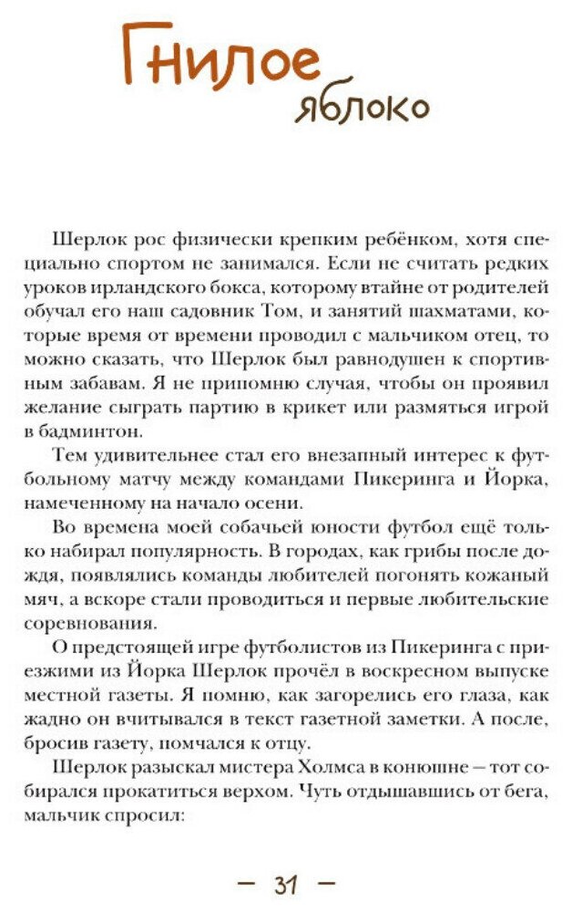 И мне, и сыну очень понравилась первая книга о мальчике Шерлоке Холмсе. Решила купить продолжении истории. Покупкой довольна на все 100% Сами истории-расследования увлекательны и познавательны. Книга великолепно оформлена. Белая плотная бумага, удобный для чтения шрифт, много хорошего качества иллюстраций. Переплёт прошитый, книгу можно открыть на полный разворот не боясь, что она развалится. Замечательная книга для семейного чтения.