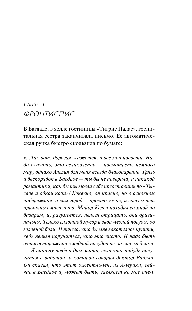 Классический детектив о Пуаро. Все события в книгах, как правило, развиваются в трех местах: в поезде, на раскопках и в Англии. В этот раз Агата Кристи не просто пишет об убийстве, в книгу она вложила частичку своих воспоминаний, ведь ей не раз приходилось путешествовать вместе с мужем и находиться на раскопках. Читается детектив бодро, мне понравился. Куплю еще пару романов. Издание хорошее, твердый переплет, бумага правда газетная, зато шрифт четкий и крупный, читать удобно.